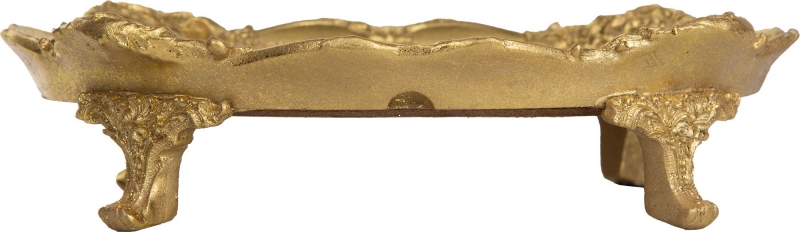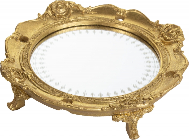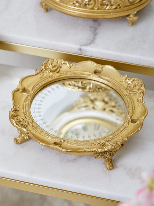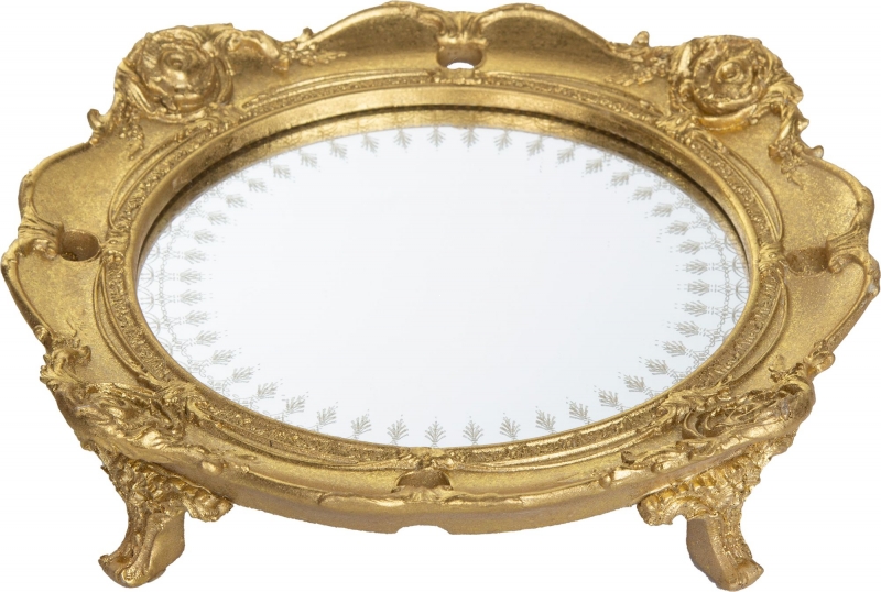 Декоративный поднос Henrieta в золотом цвете с зеркальной поверхностью выполнен в эстетике барокко и винтажной классики. Овальная форма смягчает силуэт, а богатый рельеф с розами, завитками и декоративным кантом делает его похожим на небольшую интерьерную драгоценность. Зеркальное основание красиво отражает свет, свечи, флаконы духов и украшения, благодаря чему композиция выглядит объёмнее и наряднее. Фигурные ножки приподнимают поднос над поверхностью и добавляют ему изящества. Лёгкий эффект искусственного состаривания придаёт вещи характер, глубину и ощущение предмета с историей.