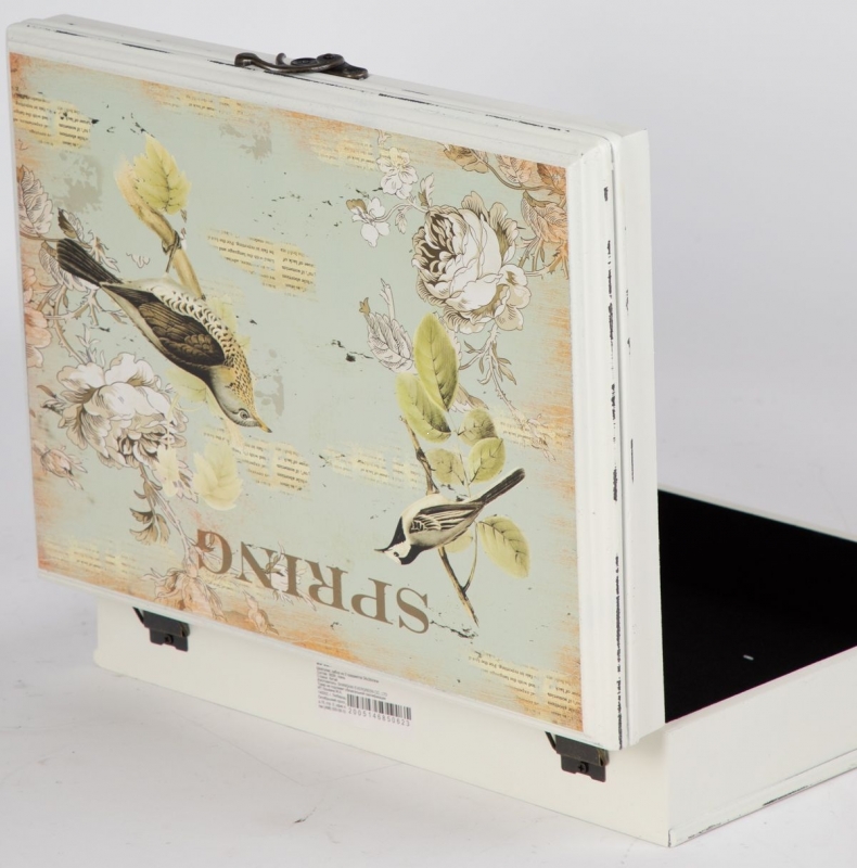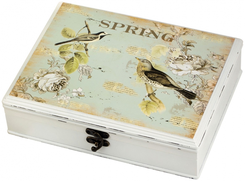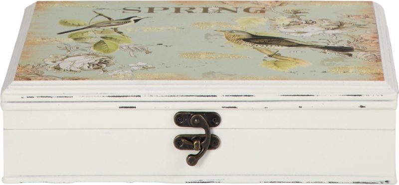Шкатулка Fedlimid в белом цвете с винтажным цветочно-птичьим декором выглядит легко, изящно и по-домашнему уютно. Крышку украшает пастельный принт с птицами, листьями, цветами и надписью SPRING на мягком голубовато-мятном фоне. Светлое основание дополнено эффектом состаренной поверхности, благодаря чему вещь напоминает интерьерные аксессуары в эстетике прованс, шебби-шик и французской классики. Тёмная металлическая застёжка выразительно контрастирует со светлой палитрой и добавляет образу завершённость. Форма строгая геометрическая, а общее впечатление — спокойное, воздушное и очень декоративное.