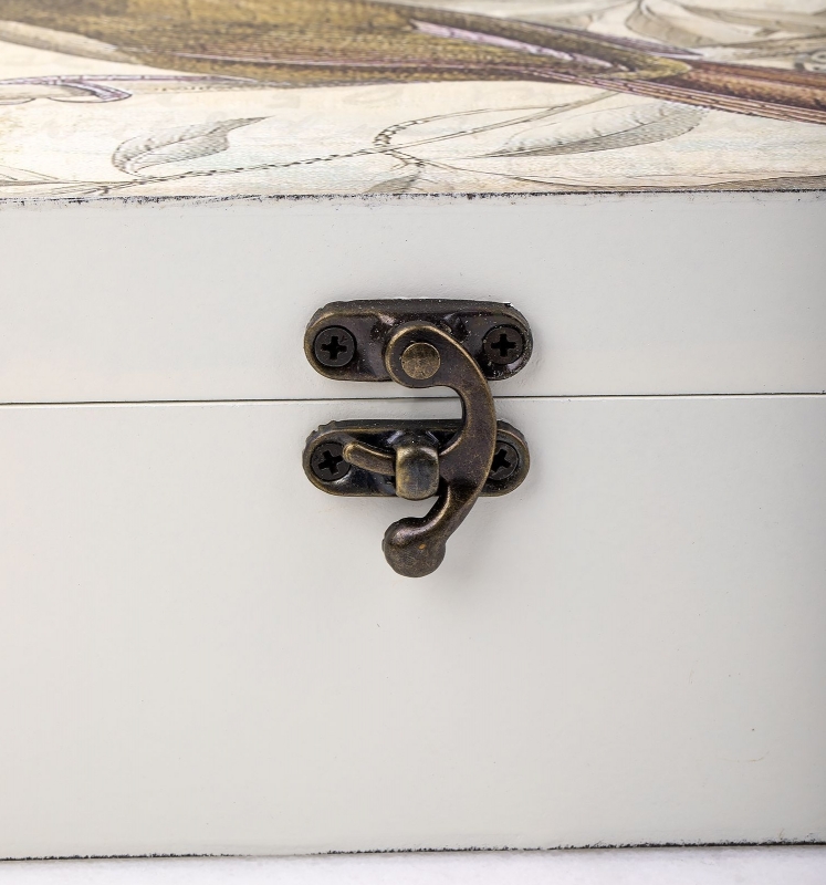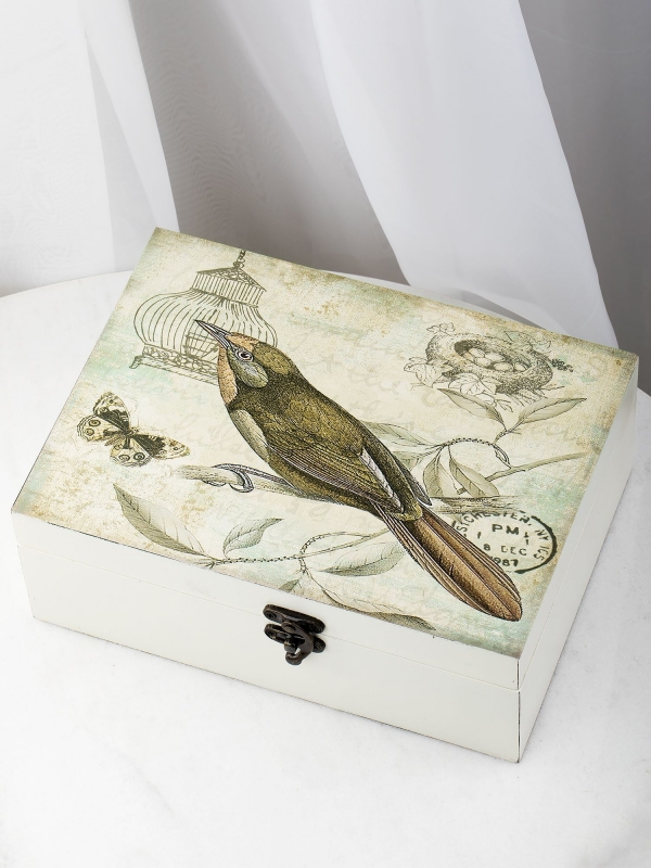 Шкатулка Conall в пастельных тонах с декоративным принтом выглядит изысканно и очень уютно. Светлый корпус в мягком молочном оттенке сочетается с крышкой, оформленной в духе винтажной иллюстрации: здесь переплетаются образ птицы, бабочки, тонкие ветви, клетка и почтовый штамп. Такая композиция напоминает старинные ботанические открытки и привносит в пространство ощущение тишины, естественности и домашнего тепла. Металлическая застёжка под бронзу подчёркивает ретро-настроение, а тёмная внутренняя отделка делает изделие визуально аккуратным и практичным для хранения мелочей.
