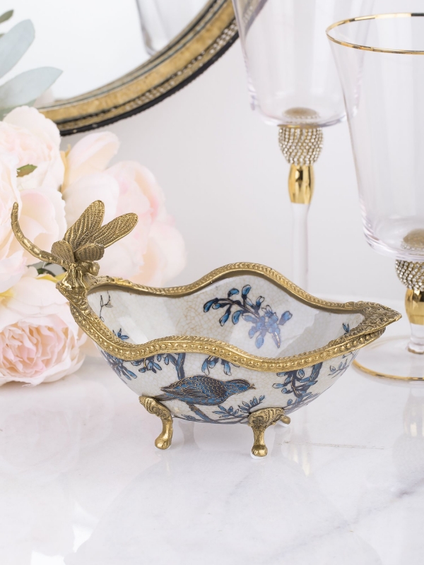 Чаша со стрекозой, выполненная из фарфора с бронзовыми элементами. Уникальное изделие ручной работы. При производстве этих художественных изделий из фарфора с бронзой используются вековые традиции китайских мастеров. Видимые трещинки (кракелюры) делаются по уникальной технологии, что придает более благородный вид старинного изделия.