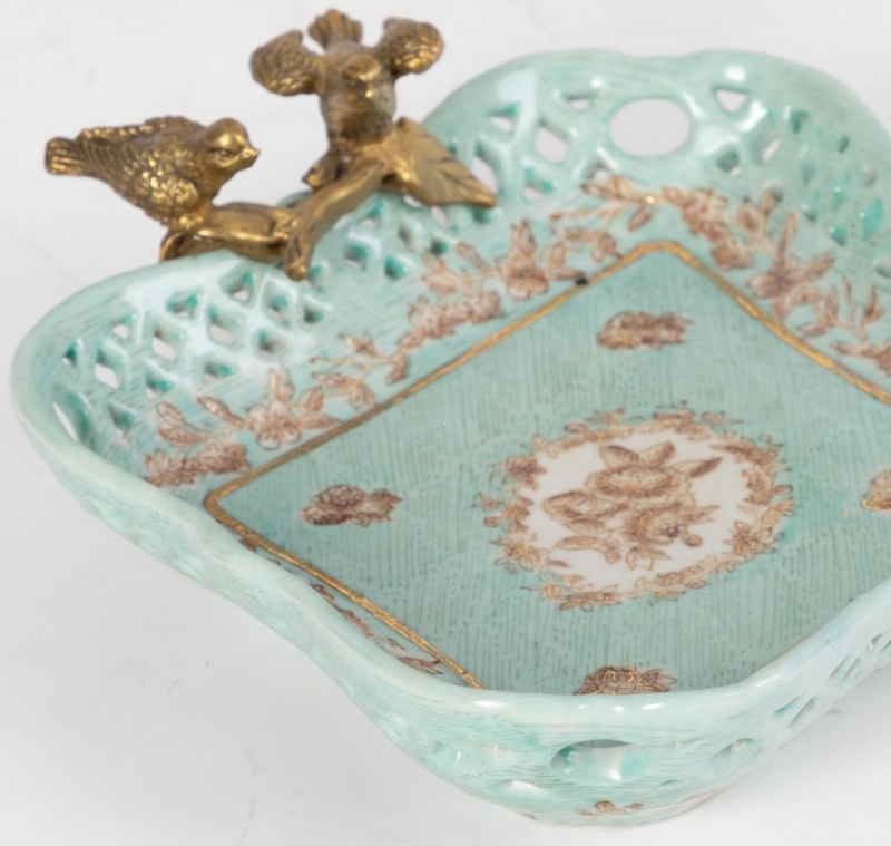 Изящное декоративное блюдо с ажурным бортом, цветочным орнаментом и фигурками птиц наполняет интерьер ощущением утончённости и тихой роскоши. Этот вариант идеально подойдет для гостиной, спальни или столовой и поможет создать атмосферу уюта, тепла и коллекционной эстетики.
