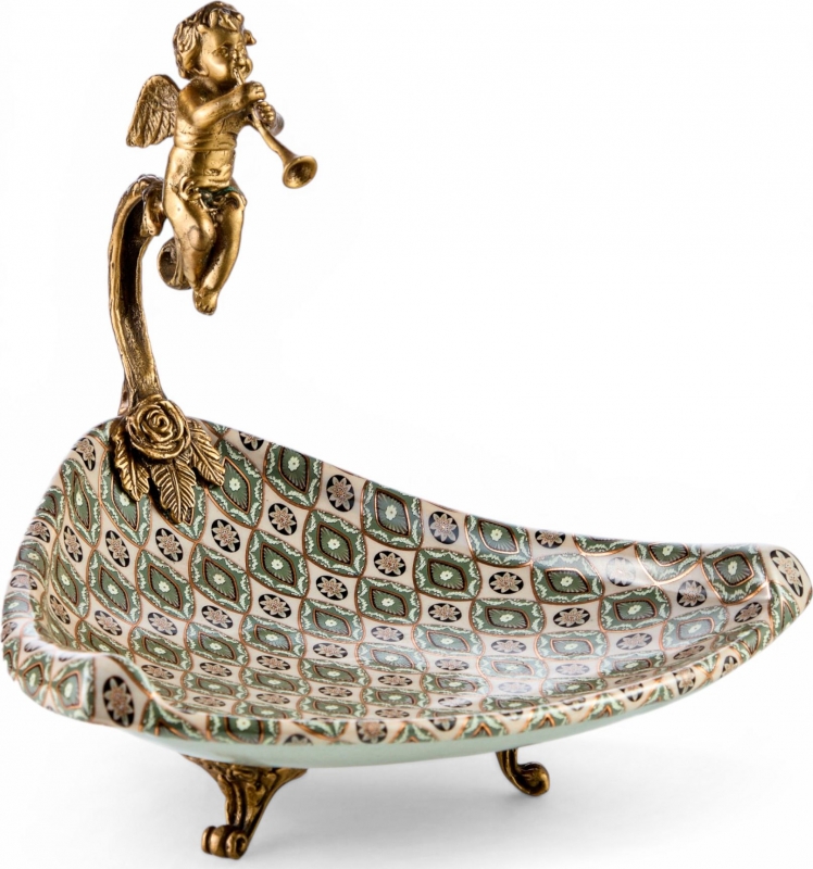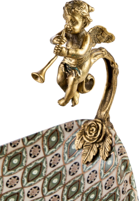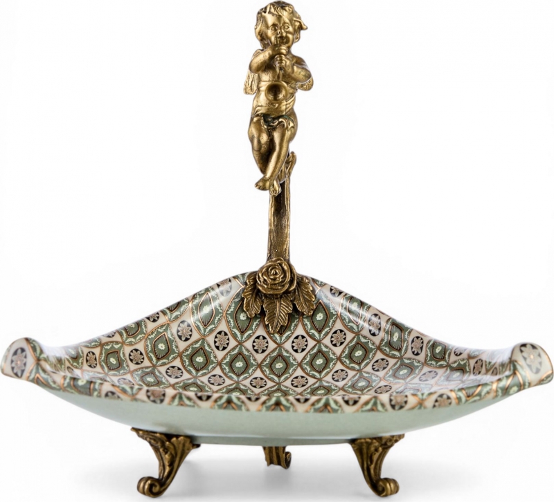 Декоративное блюдо Skadi в бело-зелёной гамме из фарфора с бронзовыми элементами звучит как маленькая интерьерная скульптура. Форма чаши плавная, вытянутая, с мягко приподнятыми краями, благодаря чему предмет выглядит лёгким и изящным. Внутренняя поверхность украшена сложным орнаментом из ромбовидных и цветочных мотивов в оттенках шалфея, кремового, серо-голубого и тёплого золота. Тонкие контуры узора перекликаются с благородным блеском ножек и фигурки ангела с трубой. Кракелюрная фактура придаёт изделию винтажный характер и ощущение старинной вещи с историей. Рельефная роза у основания и изогнутая бронзовая линия делают композицию особенно выразительной.