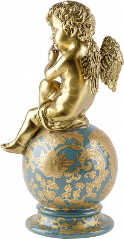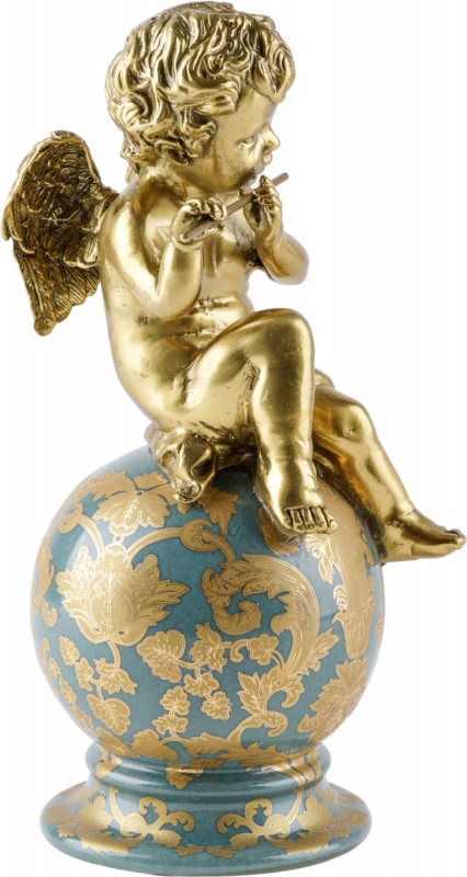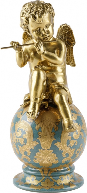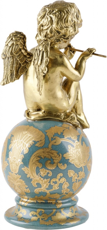 Фигурка изображает ангела, который с нежностью играет на флейте, сидя на шаре. Стиль работы - классический, с элементами барокко. Цветовая гамма включает нежные оттенки голубого и золотого, что делает изделие особенно привлекательным. Фарфор, из которого выполнена фигурка, обладает тонкой текстурой, а бронзовые элементы добавляют ей роскоши. Каждый деталь проработана с особой тщательностью, а уникальная технология создания кракелюров придает изделию благородный вид старинного предмета.