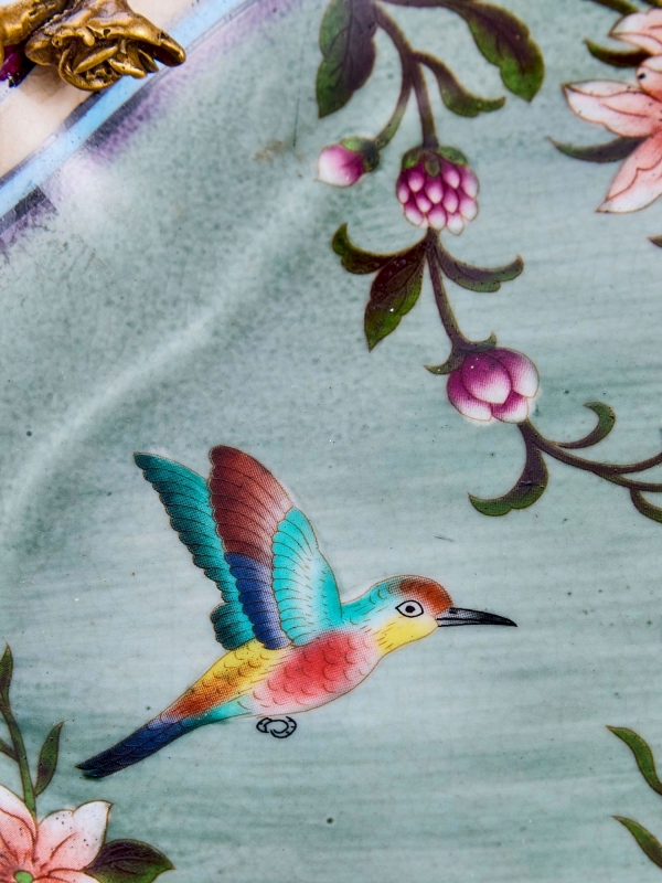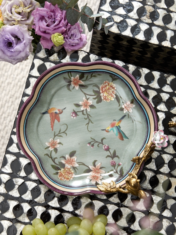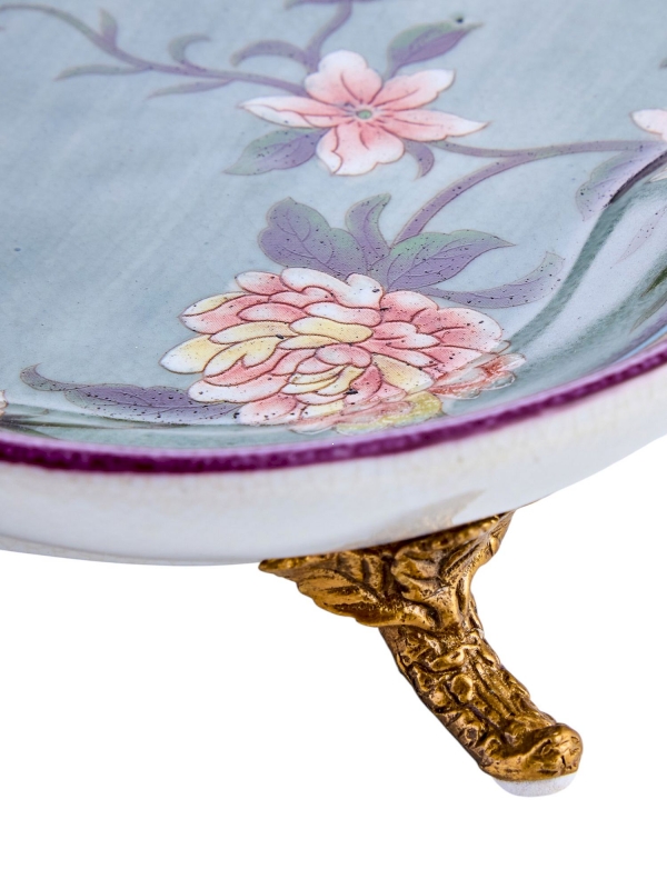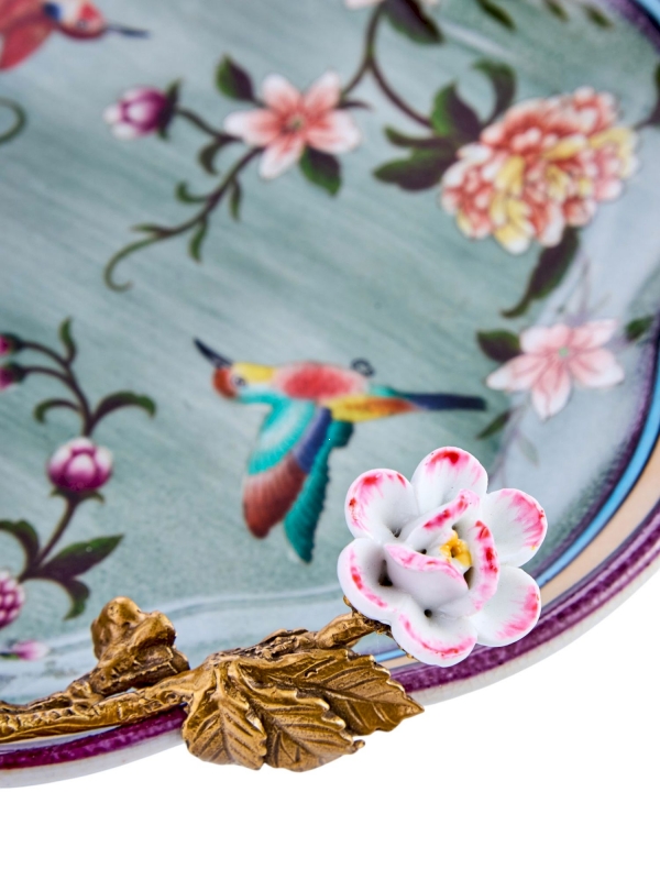 Декоративное блюдо Jimmu из фарфора в нежной зелёно-голубой гамме с бронзовыми элементами выглядит как маленький интерьерный арт-объект. Форма мягко волнистая, с плавным асимметричным контуром и тонким кантом в сливочных, голубых и сливово-фиолетовых оттенках. Внутренняя часть украшена тонкой цветочной росписью и изображениями птиц, что придаёт композиции лёгкость и живое настроение. Особый акцент создаёт бронзовая ветвь с белкой и миниатюрным цветком, а также фигурные ножки, благодаря которым блюдо смотрится особенно выразительно. Фарфор с деликатным кракелюром усиливает ощущение благородной старины и ручной работы.
