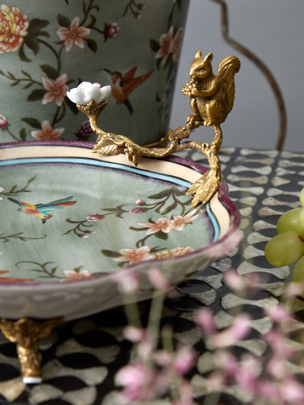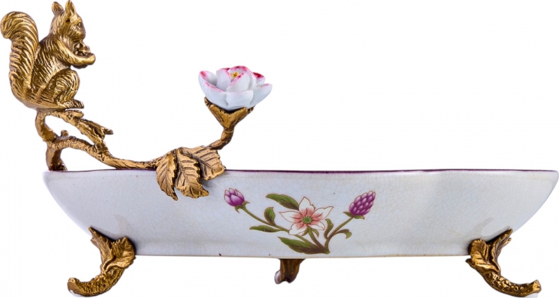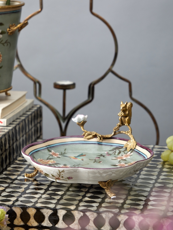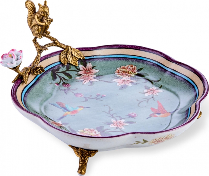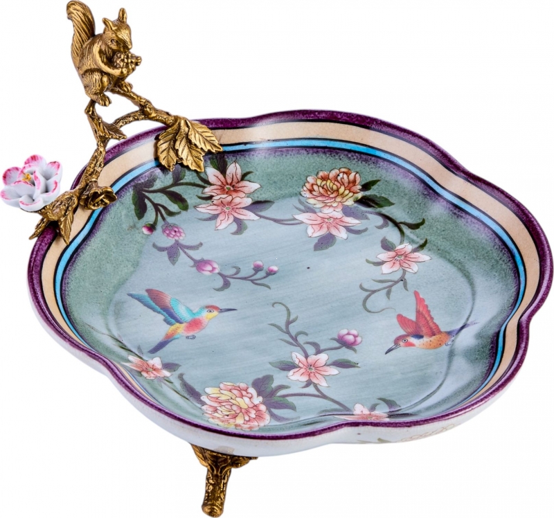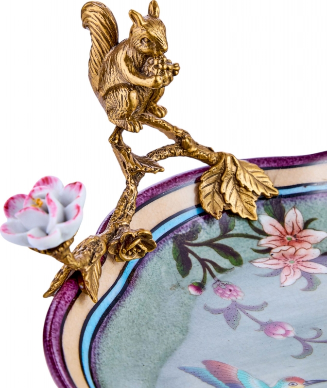 Изящное декоративное блюдо с цветами, птицами и бронзовой фигуркой белки добавляет интерьеру поэтичность и характер. Этот вариант идеально подойдет для консоли, журнального столика или столовой зоны и поможет создать атмосферу утончённого уюта.