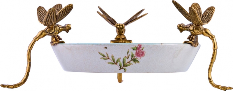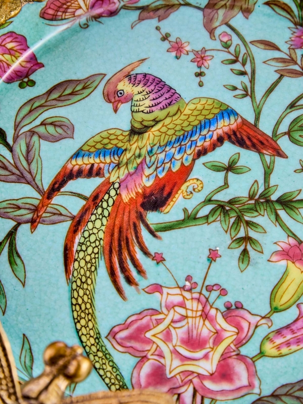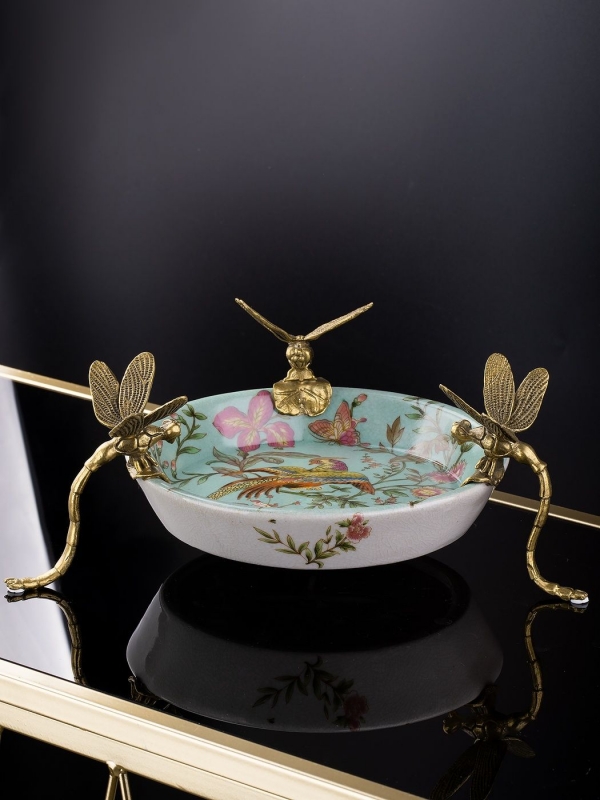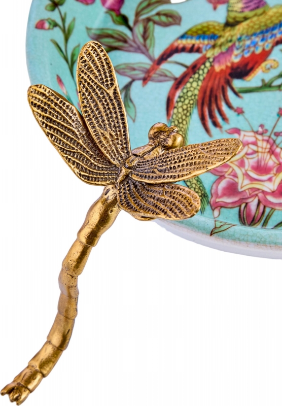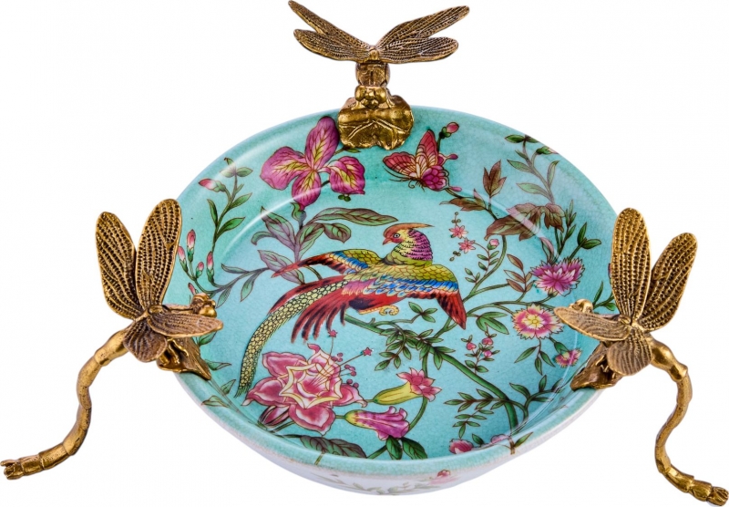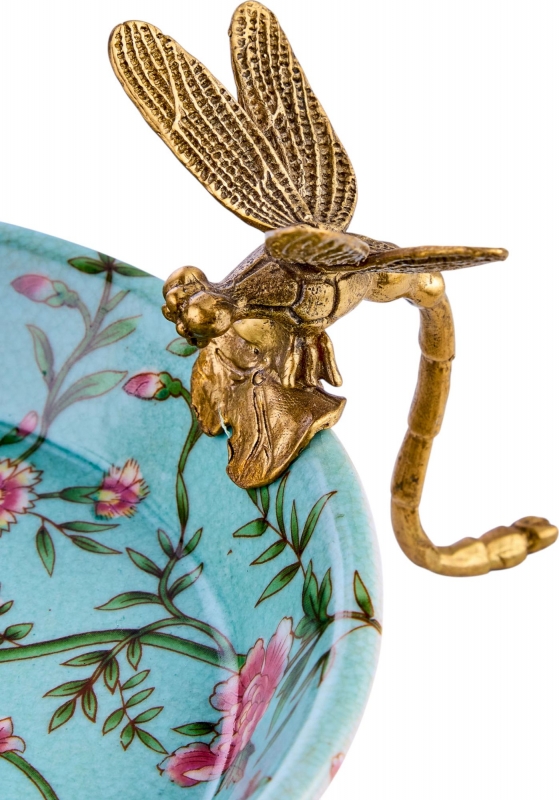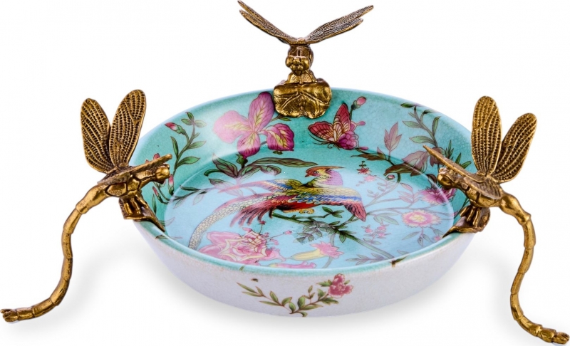 Декоративное блюдо Vesna в бирюзово-пудровой гамме из фарфора с бронзовыми элементами выглядит как маленький интерьерный арт-объект. Внутренняя часть украшена детализированным рисунком с экзотической птицей, цветами, бабочками и тонкими ветвями, благодаря чему композиция кажется живой и воздушной. Край и опоры оформлены выразительными фигурками стрекоз из металла в тёплом бронзовом оттенке, которые одновременно служат эффектным акцентом и формируют узнаваемый силуэт. Лёгкий кракелюр на поверхности усиливает ощущение благородной старины, а сочетание небесно-голубого фона, розовых оттенков и золотистой бронзы делает блюдо особенно декоративным и запоминающимся.
