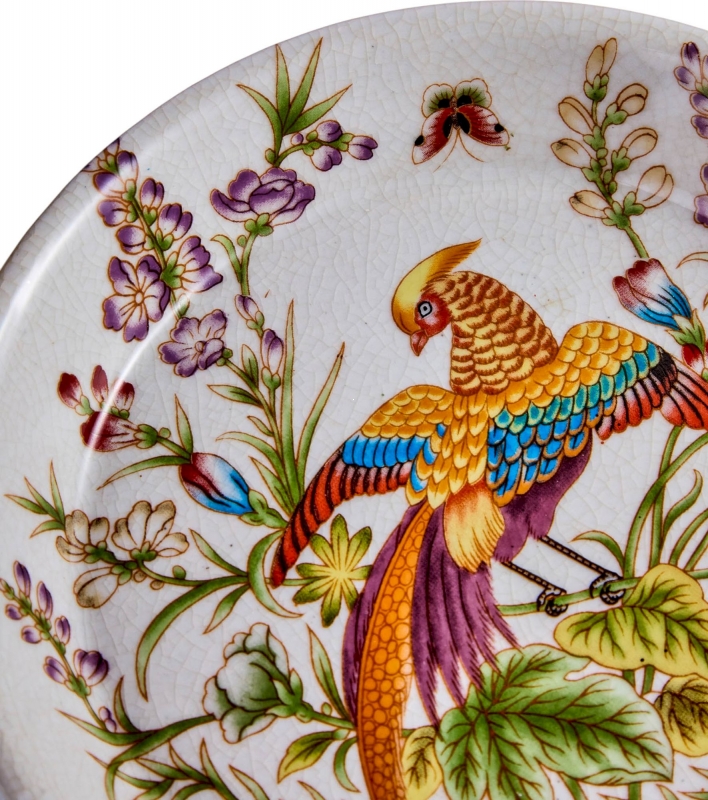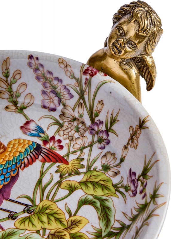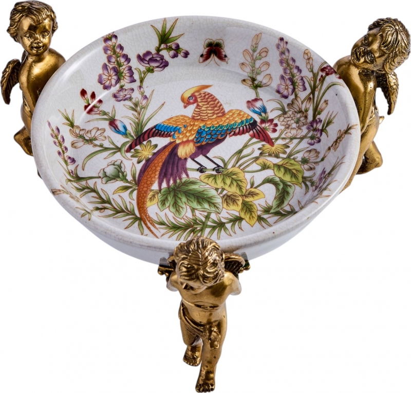 Блюдо декоративное Filip от HomeAdore в белом цвете с многоцветной росписью и бронзовыми элементами выглядит как художественный объект с антикварным настроением. Фарфоровая чаша украшена тонким ботаническим орнаментом и ярким изображением райской птицы в золотистых, синих, лиловых и зелёных оттенках. Основанием служат три фигурки ангелов с выразительной пластикой и благородным металлическим блеском. Поверхность дополнена деликатным кракелюром, который усиливает эффект старинного изделия и делает образ глубже. Такое декоративное блюдо привлекает внимание не только рисунком, но и скульптурной подачей, создавая ощущение ручной работы и интерьерной ценности.