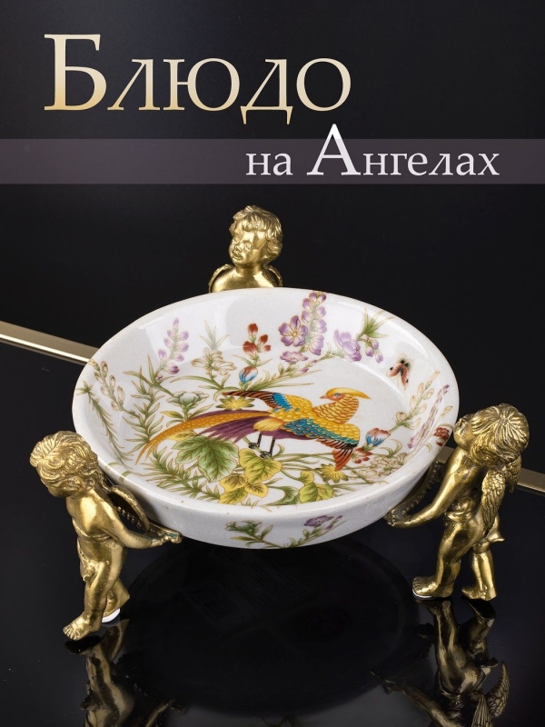 Изящное декоративное блюдо с фарфоровой чашей, цветочной росписью и золотистыми ангелами наполняет интерьер ощущением коллекционной редкости. Этот вариант идеально подойдет для гостиной, кабинета или столовой и поможет создать атмосферу утончённой классики и тёплой роскоши.