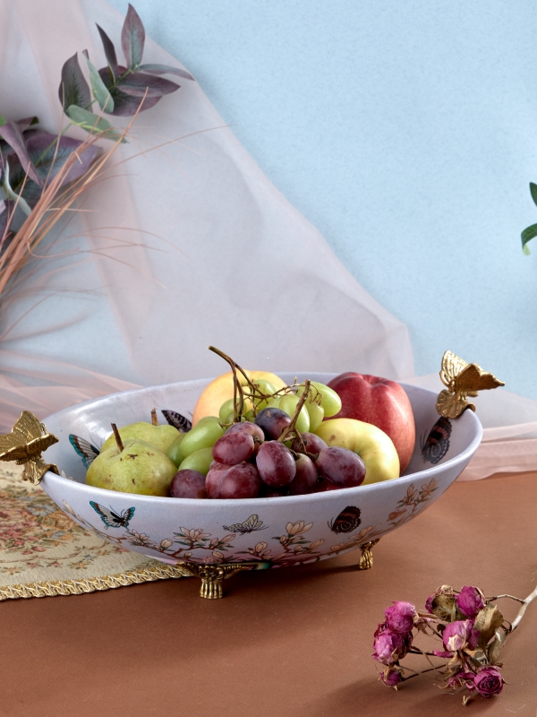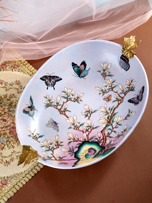 Декоративное блюдо Floriana в светлом перламутрово-лавандовом оттенке из фарфора с бронзовыми элементами выглядит как коллекционный предмет с тонкой художественной историей. Овальная форма делает силуэт мягким и элегантным, а высокие фигурные ручки в виде бабочек и миниатюрные ножки придают композиции скульптурную выразительность. Поверхность украшена цветущими ветвями, порхающими бабочками и деликатными переливами цвета, которые создают эффект живописной глубины. Лёгкий кракелюр подчеркивает эстетику винтажного фарфора и добавляет изделию благородный характер ручной работы. Такое блюдо становится заметным акцентом и украшает пространство даже без дополнительного наполнения.
