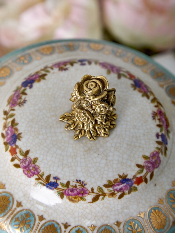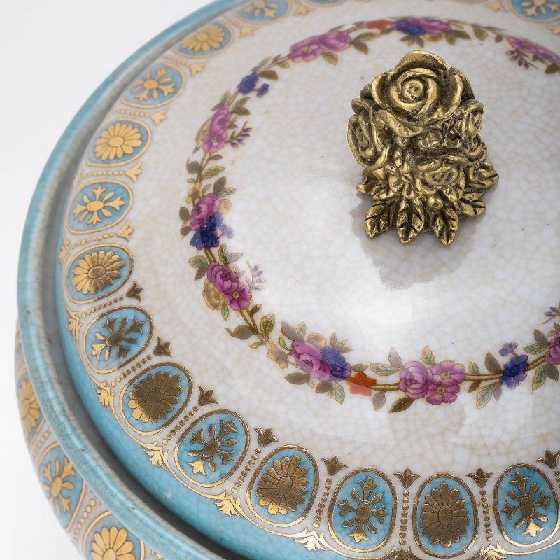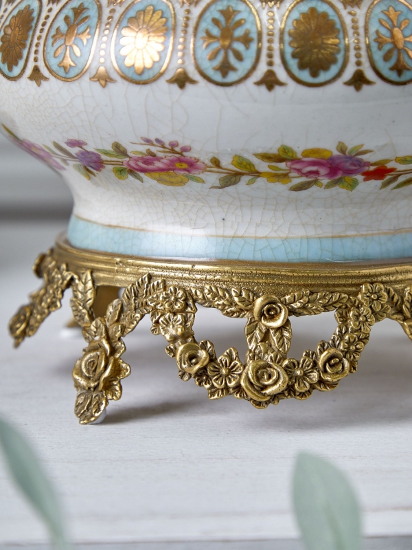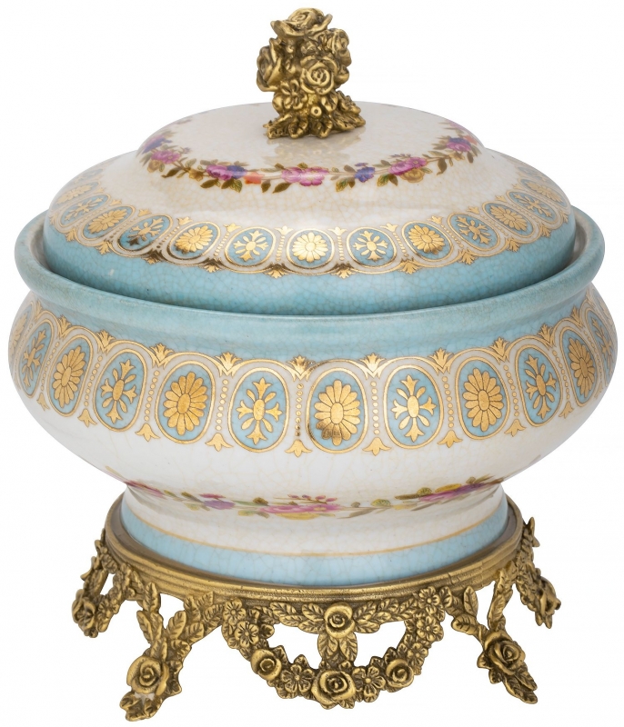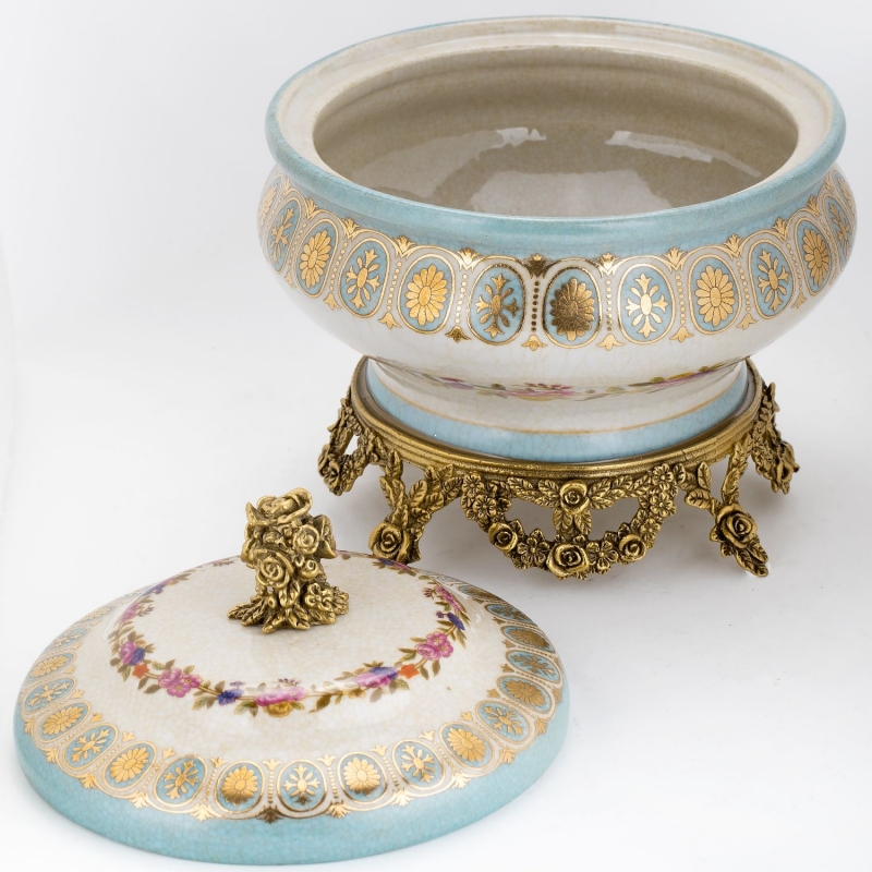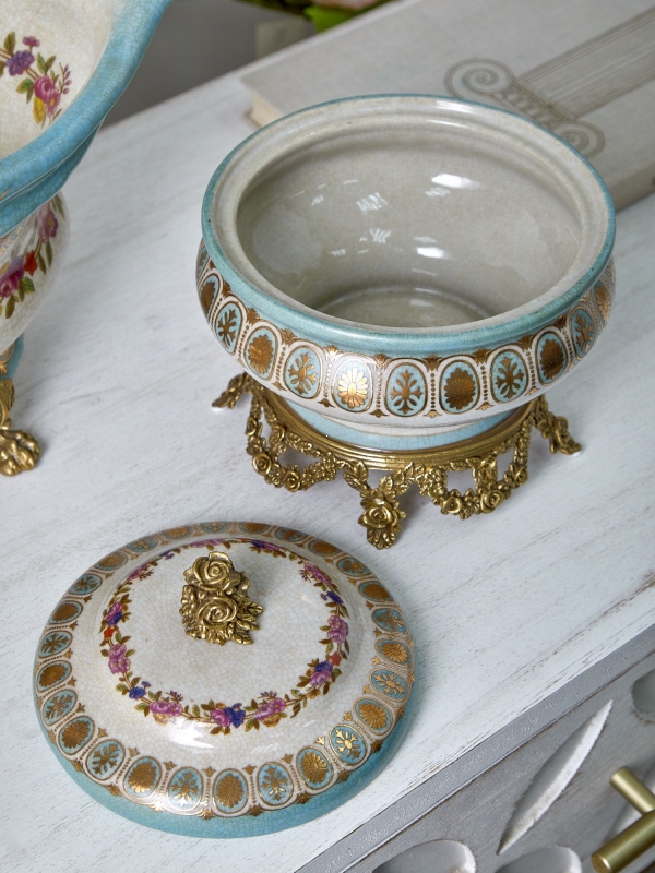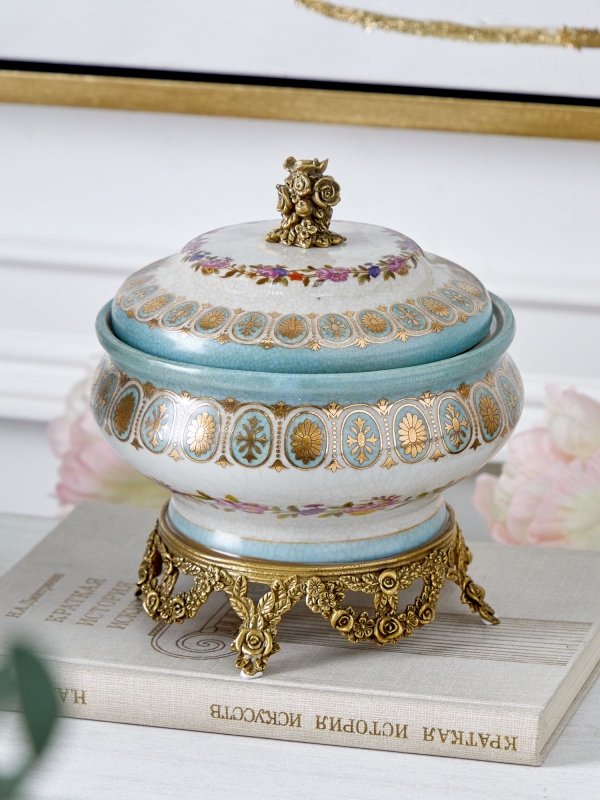 Изящная фарфоровая шкатулка с бронзовым декором словно хранит атмосферу старинного будуара: нежная бирюза, цветочные гирлянды, золотистые акценты и благородный кракелюр. Этот вариант идеально подойдет для спальни, гостиной или туалетного столика и поможет создать атмосферу утончённости и тепла.