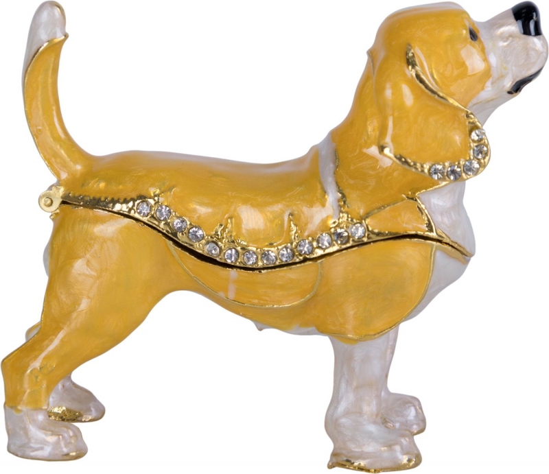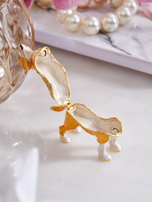 Шкатулка Baihu HomeAdore в виде собаки в золотисто-белой гамме с металлическим блеском и стразами выглядит как маленькая интерьерная драгоценность. Фигура выполнена с выразительной анималистичной пластикой: приподнятый хвост, мягкие линии корпуса, аккуратная мордочка и рельефная проработка шерсти делают образ живым и обаятельным. Глянцевая эмаль красиво играет на свету, золотистая окантовка подчеркивает контуры, а ряд сияющих кристаллов превращает шкатулку в эффектный акцент. Крышка открывается по линии корпуса, сохраняя цельность формы и декоративность. Такой предмет одновременно украшает пространство и бережно хранит небольшие украшения или памятные мелочи.