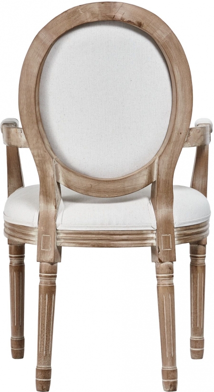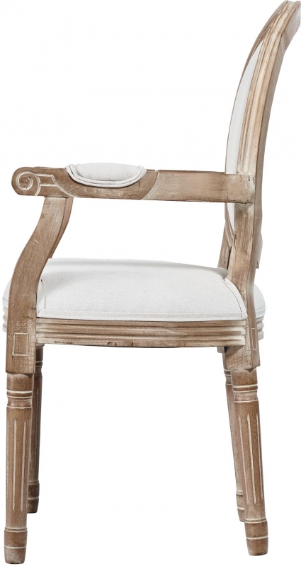 Стул Tyrone впечатляет своим элегантным дизайном, который сочетает в себе классику и современность. Овальное сидение и спинка покрыты льняной тканью, а подлокотники и ножки выполнены из натурального дерева с эффектом искусственного состаривания. Такой подход подчеркивает уникальность изделия, а матовая отделка лака добавляет мягкости и теплоты. Стул украшен изображениями распустившихся цветов, что придаёт ему неповторимый характер.