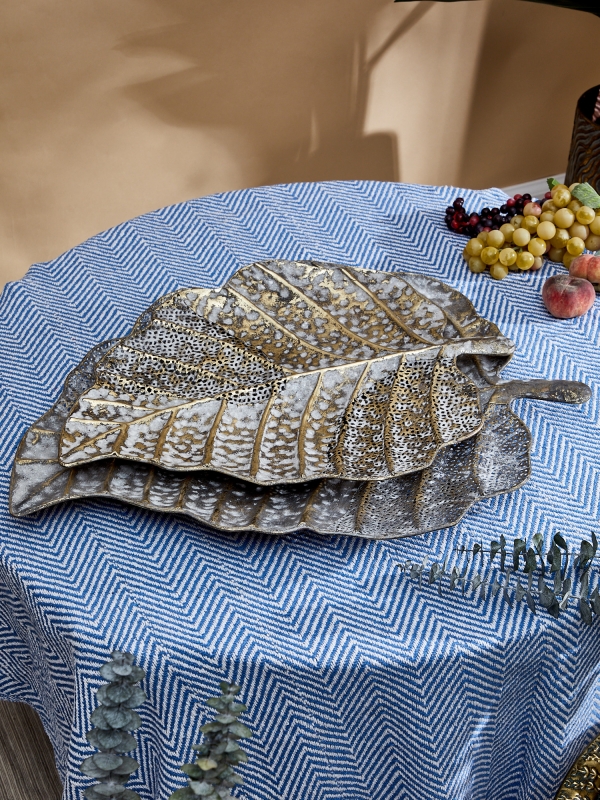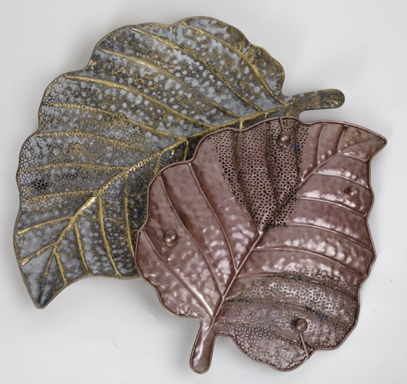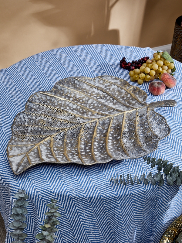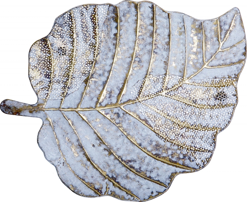 Декоративное блюдо Oddrun в форме листа в состаренном серо-золотистом оттенке выглядит как акцентный предмет с художественным характером. Плавный природный контур, рельефные прожилки и ажурные фрагменты создают выразительную игру света и тени. Поверхность сочетает матовую основу, эффект патинирования и деликатный металлический блеск, благодаря чему изделие смотрится многослойно и дорого. Следы ручной обработки и заметные сварочные швы не скрываются, а становятся частью образа, подчеркивая ремесленную эстетику. Такое декоративное блюдо привносит в пространство природный мотив, ощущение фактуры, тепла и интерьерной глубины.