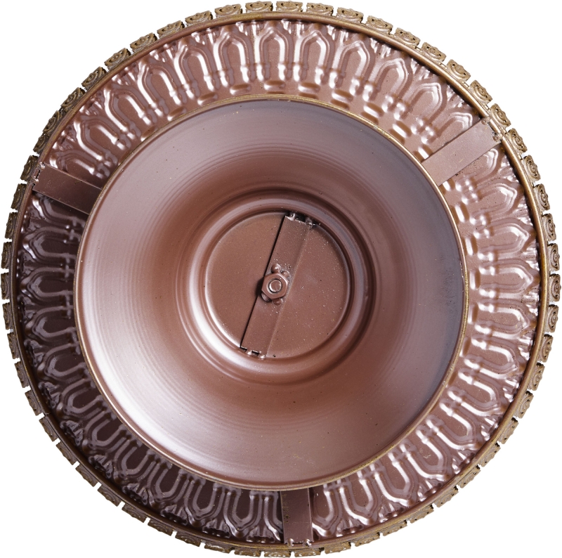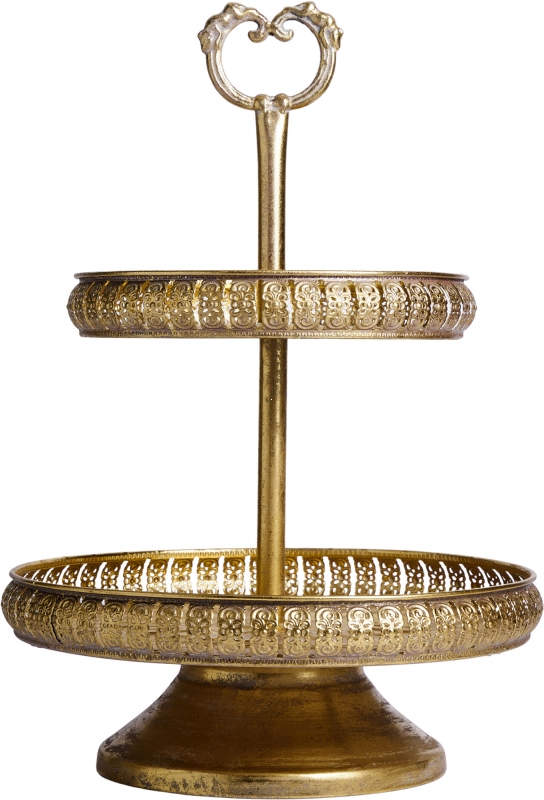 Этажерка декоративная Embla в золотистом металлическом исполнении сочетает в себе выразительный винтажный характер и утончённую декоративность. Два круглых яруса оформлены рельефным дном с лучеобразным узором и ажурными бортиками, благодаря чему композиция выглядит нарядно даже без наполнения. Тёплый оттенок состаренного золота делает металл визуально мягче и благороднее, а фигурная ручка в верхней части добавляет силуэту изысканный акцент. Основание устойчивое и пропорциональное, поэтому этажерка смотрится собранно и гармонично на столе, комоде или консоли. Такой предмет легко становится заметной деталью сервировки и интерьерным украшением одновременно.