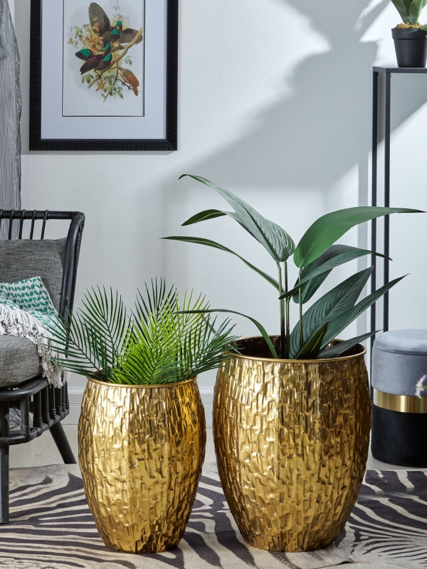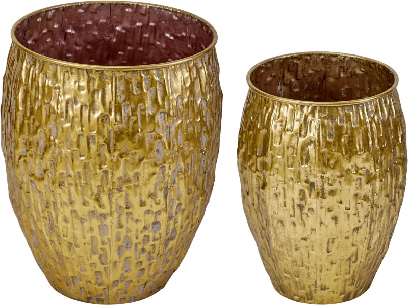 Набор из двух кашпо, выполненных из металла с напылением золотистого цвета и фактурной отделкой, создан для сухоцветов и искусственных цветочных композиций. Растения, размещенные в эти кашпо, произведут необычный образ в вашем интерьере. Эксклюзивные формы и фактуры навеяло богатство культуры Африки, множество художественных традиций и таинственная атмосфера, окутывающая неподражаемостью.