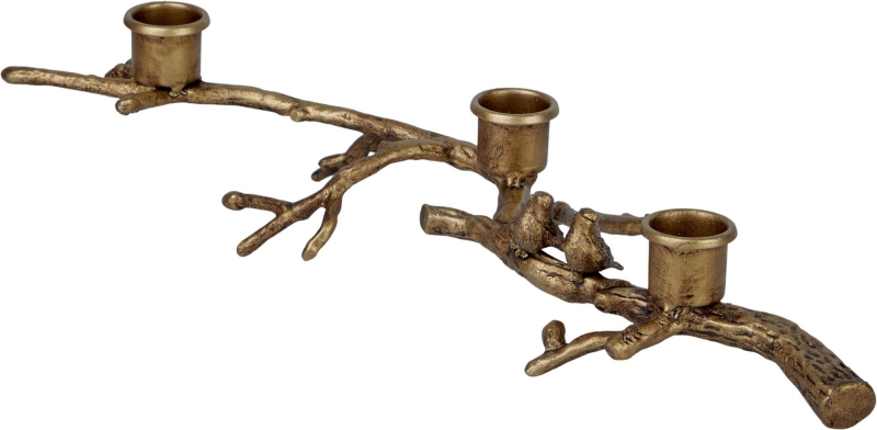 Подсвечник «Josefina» выполнен из металла с эффектом искусственного состаривания, что придает ему уникальный и привлекательный вид. Его форма в виде ветви с элементами в виде милых птиц символизирует природу и гармонию. Золотистая цветовая гамма, благодаря эффекту патинирования, создает атмосферу тепла и уюта. Каждая деталь, от текстуры ветки до аккуратных чашечек для свечей, проработана с любовью, что делает этот подсвечник настоящим произведением искусства.