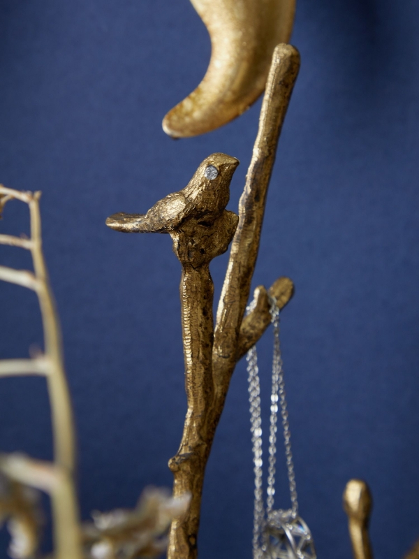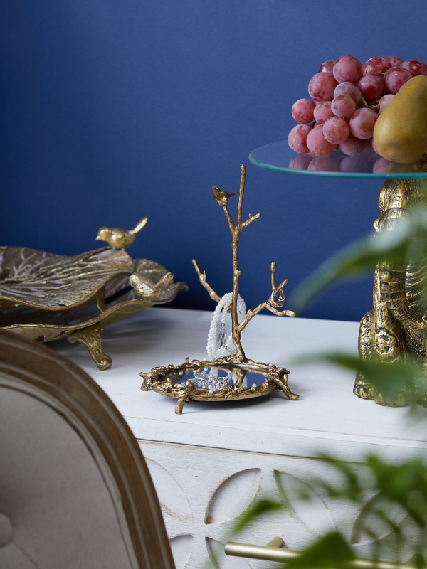Декоративное блюдо Raiden в состаренном золотом цвете с зеркальной поверхностью выполнено в образе фантазийной ветви с маленькой птичкой. Композиция выглядит как мини-скульптура: основание оформлено в виде овального блюда на фигурных ножках, обрамлённого листьями, цветами и декоративными вставками, напоминающими жемчужины и кристаллы. Вертикальная ветка служит держателем для колец, серёг и цепочек, а зеркальная чаша красиво отражает свет и украшения. Фактура нарочито неровная, с эффектом ручной работы и благородного состаривания, благодаря чему предмет смотрится выразительно, тепло и по-настоящему интерьерно.