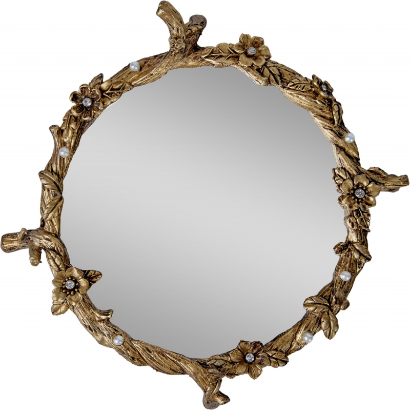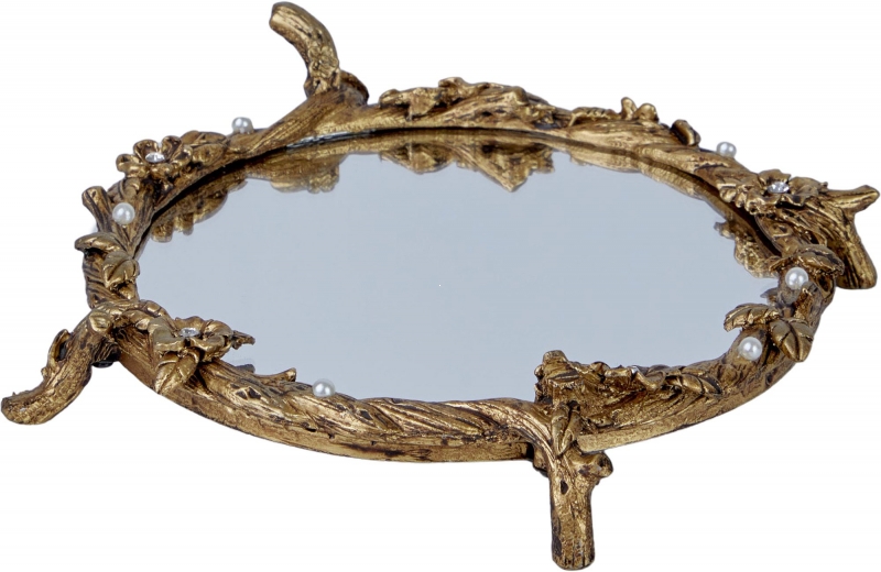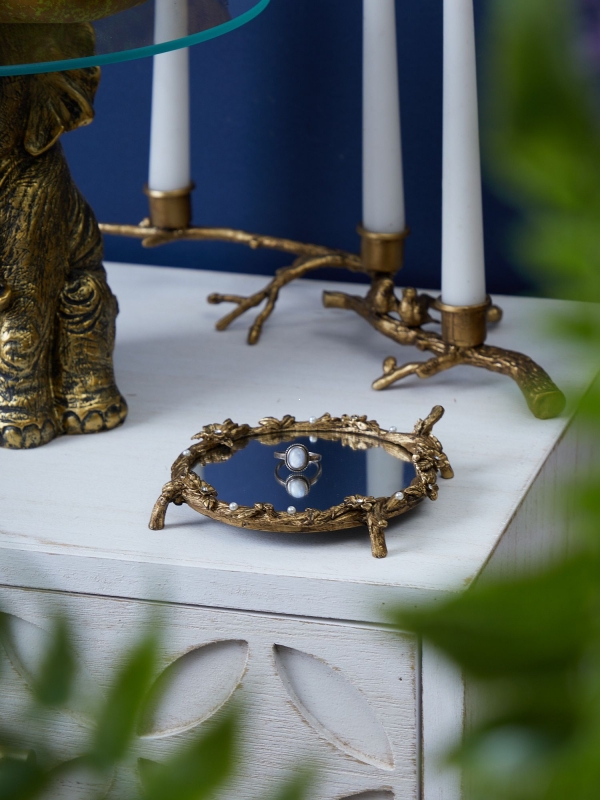 Декоративное блюдо Raiden в золотистом цвете с зеркальной поверхностью выполнено в образе природного венка из переплетённых ветвей, листьев и цветов. Форма выглядит живой и пластичной, благодаря чему предмет воспринимается не просто как подставка для украшений, а как самостоятельный арт-объект. Тёплый оттенок состаренного золота подчёркивает винтажный характер, а миниатюрные жемчужные и кристаллические детали добавляют деликатное сияние. Зеркальная вставка визуально облегчает композицию, красиво отражает свет и делает даже небольшие украшения заметнее. Невысокие фигурные опоры придают блюду завершённость и делают его особенно эффектным на открытой поверхности.