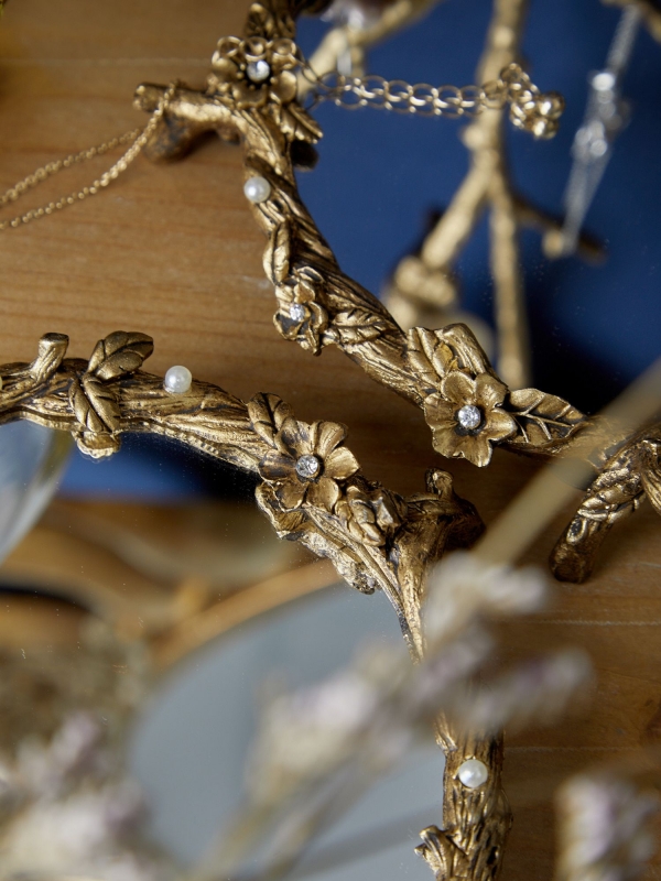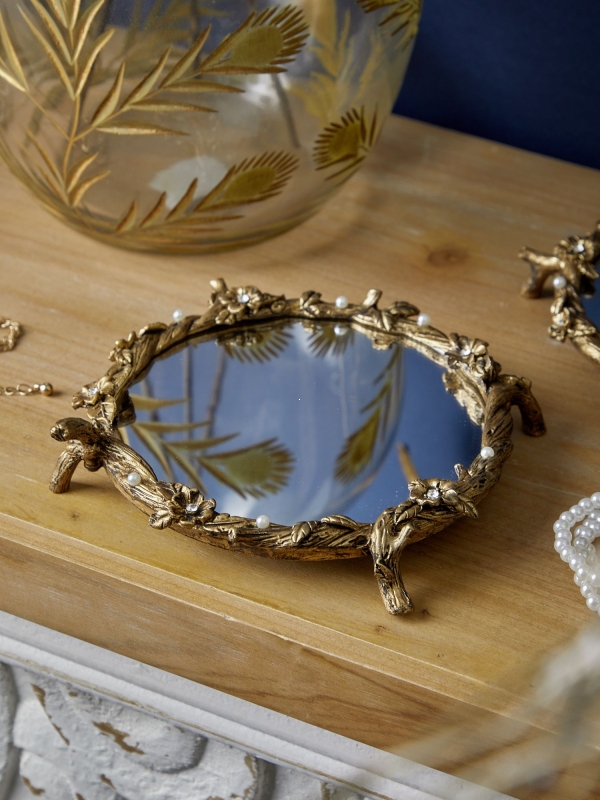 Изящное декоративное блюдо сочетает в себе скульптурную выразительность и практичность: ветви, цветы, жемчужные акценты и зеркальная поверхность создают эффект драгоценной находки. Этот вариант идеально подойдет для туалетного столика, комода или консоли и поможет создать атмосферу утончённого уюта.