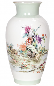 Ваза выполнена в винтажном стиле, с яркими цветами, включая розовый и золотистый. Ключевые элементы дизайна: цветочные мотивы и изображения животных, создающие уникальную атмосферу.