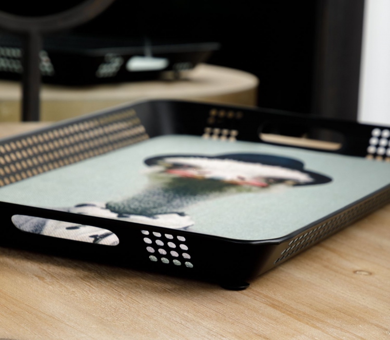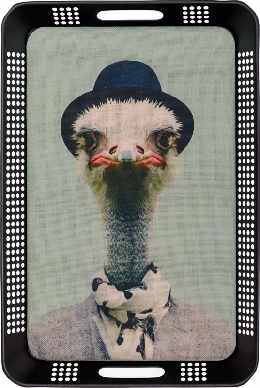Декоративный поднос Kalevi в черном цвете с арт-принтом страуса сочетает функциональность и выразительный характер интерьерного декора. Прямоугольная форма со скругленными углами выглядит аккуратно и современно, а глубокая черная рамка с перфорацией по периметру добавляет графичности и визуальной легкости. Центральная часть оформлена как художественный портрет: страус в шляпе, пиджаке и шейном платке создает эффект ироничной галерейной подачи. Светлый фон смягчает образ, а контраст черной окантовки делает композицию особенно заметной. Поверхность смотрится гладкой и аккуратной, а встроенные ручки поддерживают удобство в использовании.