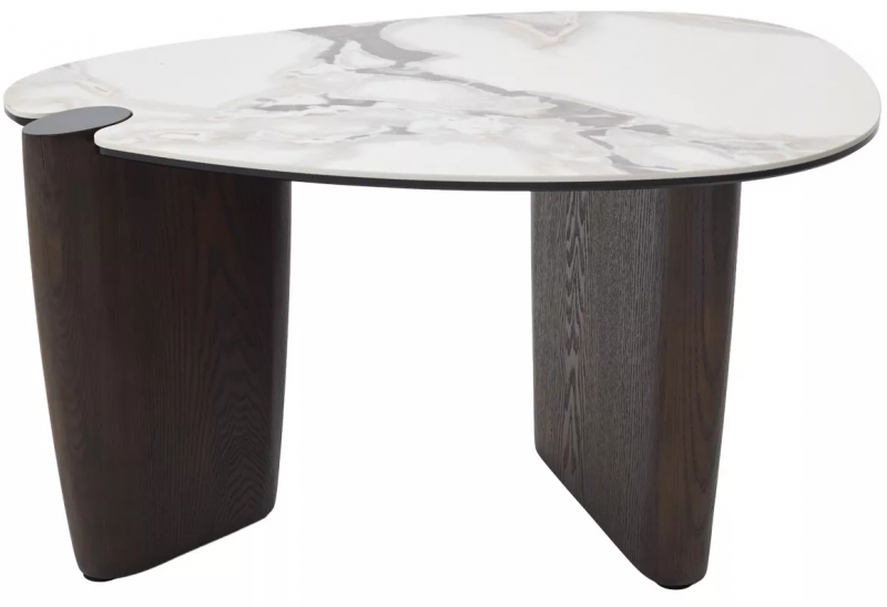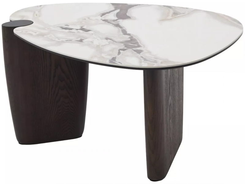 Столик Dag Fendi представляет собой гармоничное сочетание современных форм и натуральных материалов. Столешница выполнена из матовой керамики, толщиной 14 мм, что придаёт ей стильный и изысканный вид. Основание изготовлено из массива дерева и МДФ, облицованного дубовым шпоном, что обеспечивает долговечность и устойчивость. Тонкие линии и округлые формы добавляют нотку игривости и динамики, создавая ощущение лёгкости.