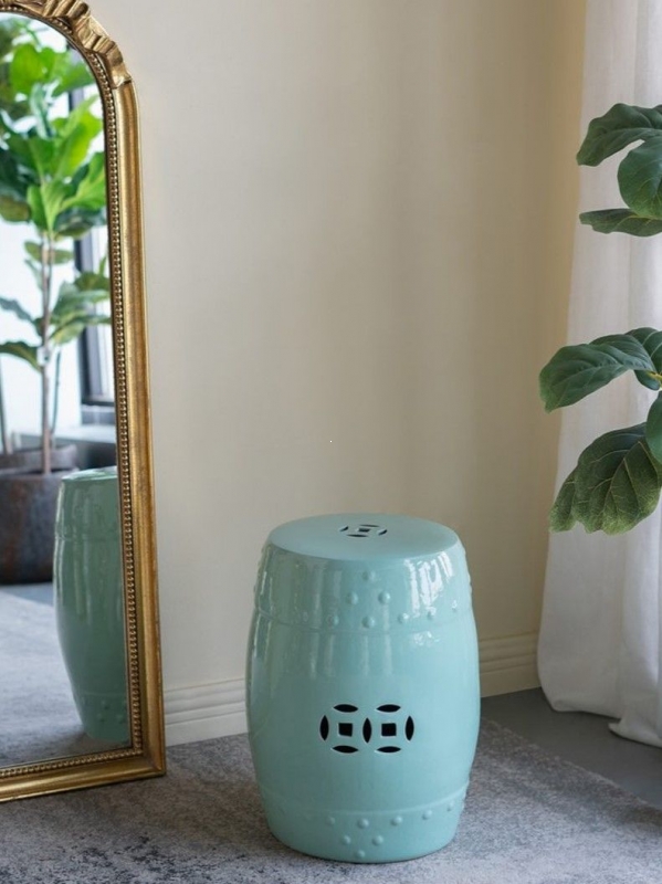 Декоративный столик имеет округлый силуэт, светло-голубой оттенок и узорчатый мотив. Он может служить приставным столиком или дополнительным местом для сидения и отлично впишется в интерьер вашей гостиной, прихожей, спальной комнаты или веранды, привлекая внимание гостей в любой обстановке.