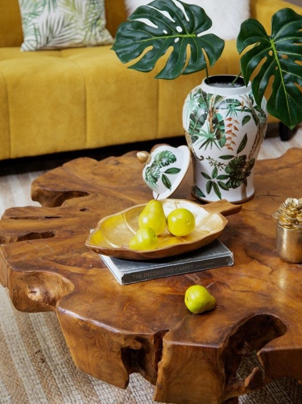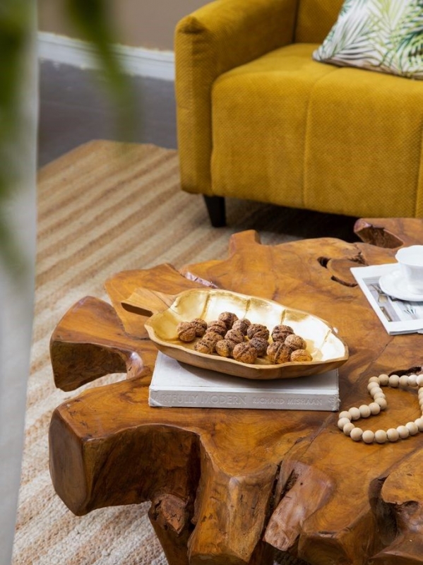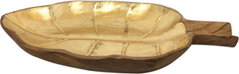 Декоративное блюдо Ymir из тикового дерева с золотистой внутренней отделкой сочетает природную выразительность и эффектный декоративный блеск. Форма листа с аккуратно проработанными прожилками делает его не просто предметом сервировки, а полноценным интерьерным акцентом. Тёплый древесный оттенок по краю и ручке красиво обрамляет сияющую внутреннюю поверхность, создавая контраст фактур и цветов. Натуральное тиковое дерево придаёт изделию ощущение основательности, а плавные неровные контуры добавляют ручной, живой характер. Блюдо выглядит уютно, стильно и органично, легко привлекает внимание на журнальном столике, консоли или обеденной поверхности.