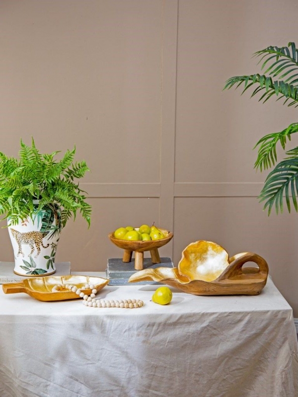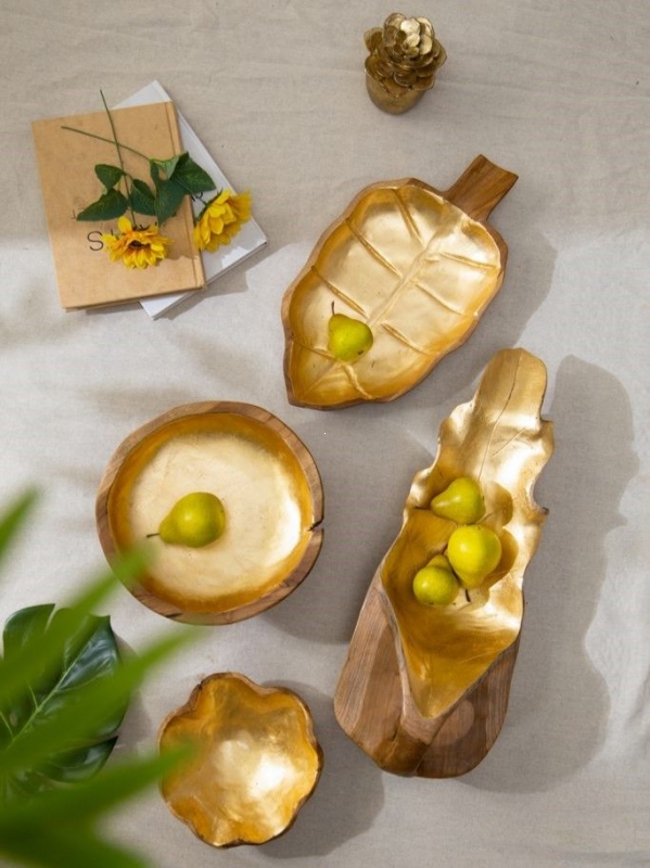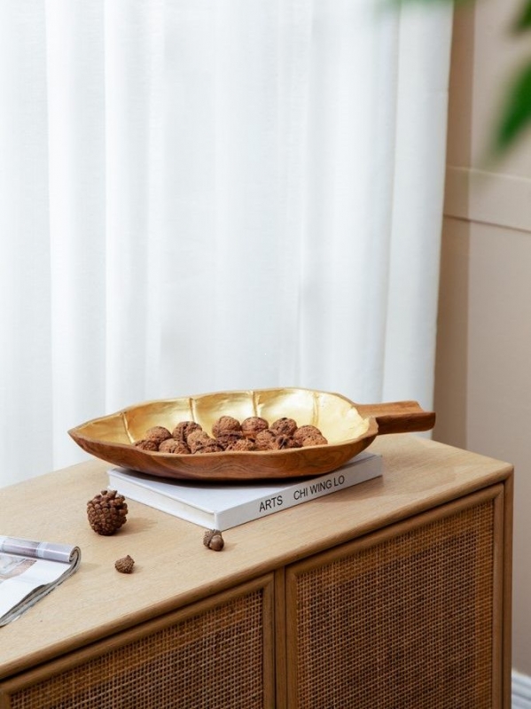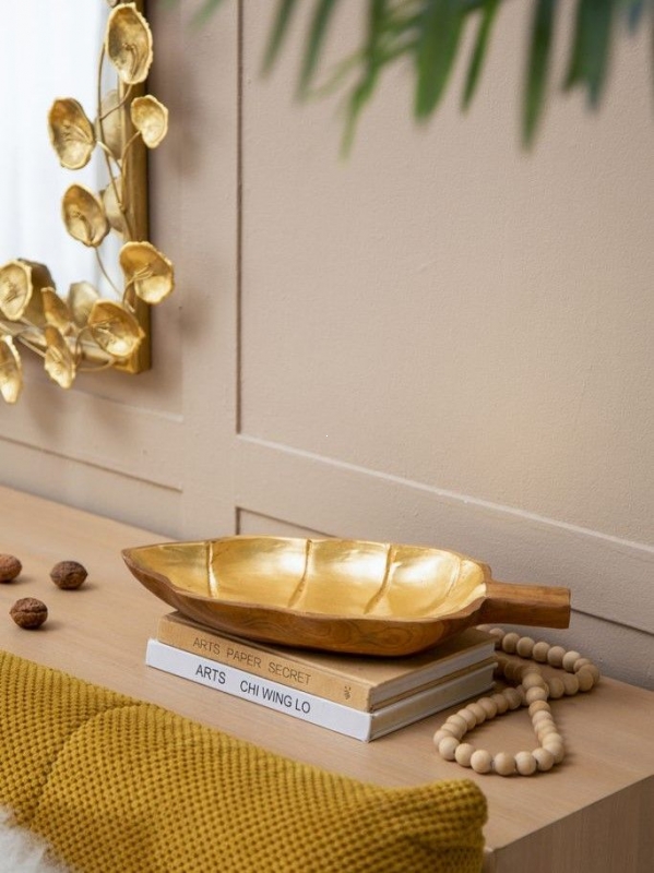 Тёплая фактура тика, благородное золотистое сияние и форма листа создают выразительный природный акцент в интерьере. Это декоративное блюдо идеально подойдет для гостиной, столовой или кухни и поможет создать атмосферу уюта, тепла и естественной роскоши.