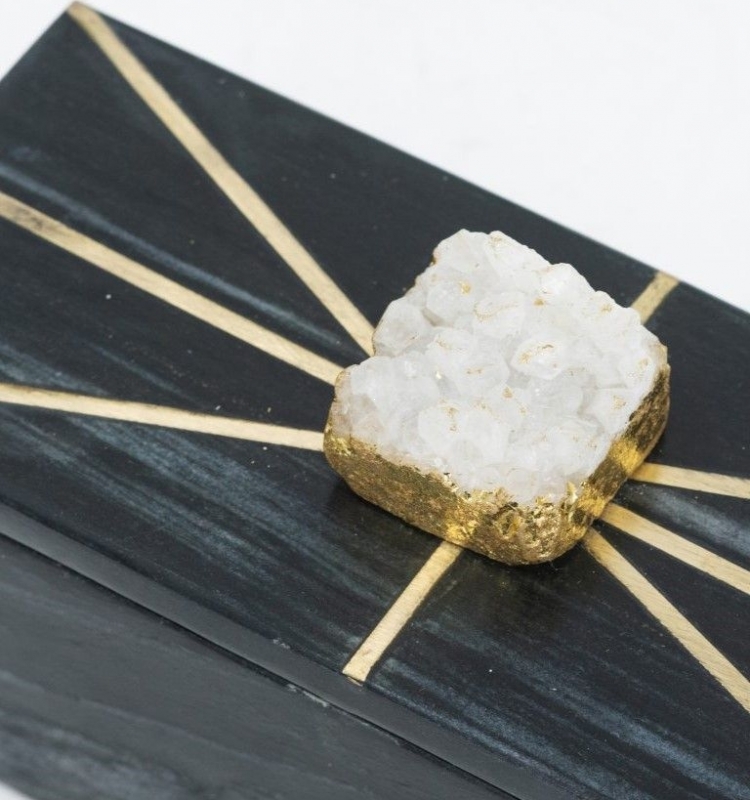 Благородный черный мрамор, тонкие золотые лучи и кристаллический акцент на крышке создают выразительный образ шкатулки для хранения украшений и мелочей. Этот вариант идеально подойдет для спальни, гостиной или кабинета и поможет создать атмосферу утонченной роскоши.