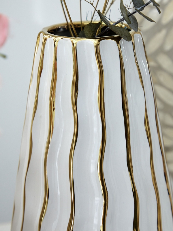Ваза Flash выполнена в стиле Ар-деко, сочетая в себе гладкую белую поверхность и изящные золотистые линии. Ключевые элементы дизайна: волнистая текстура и золотые акценты, которые создают эффект игры света.