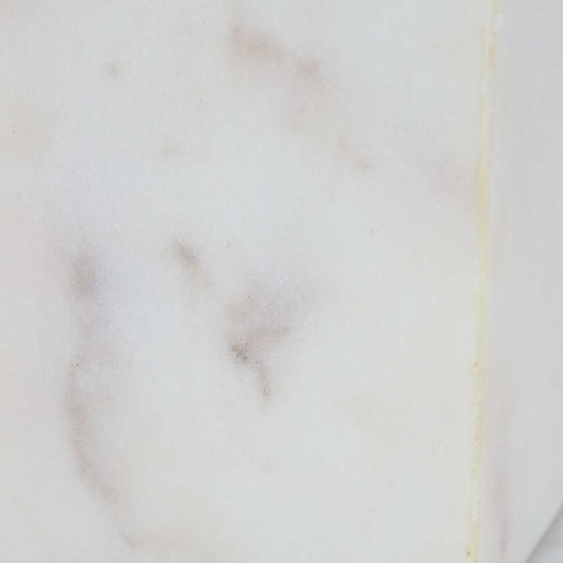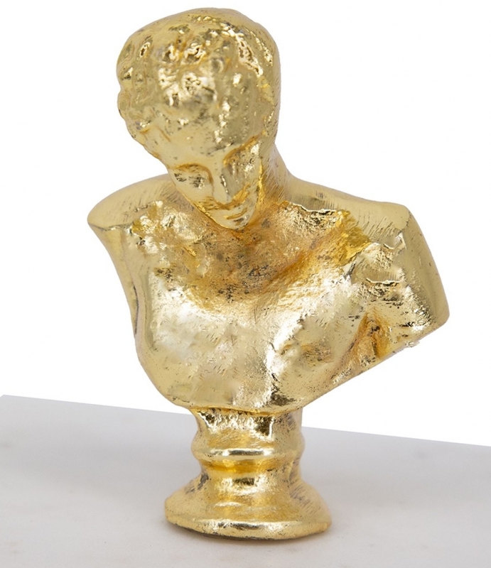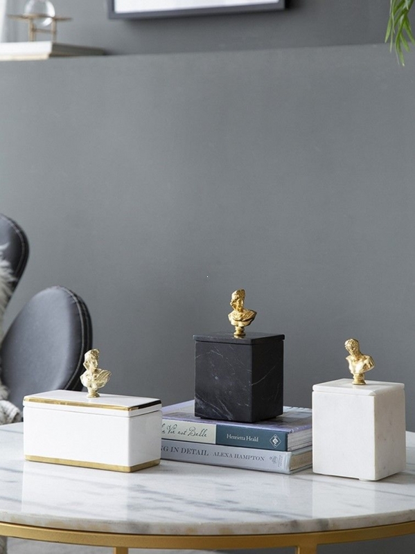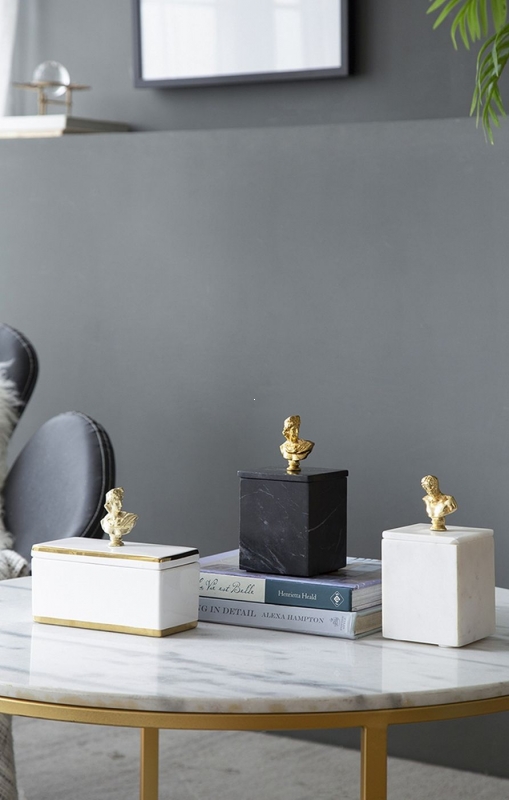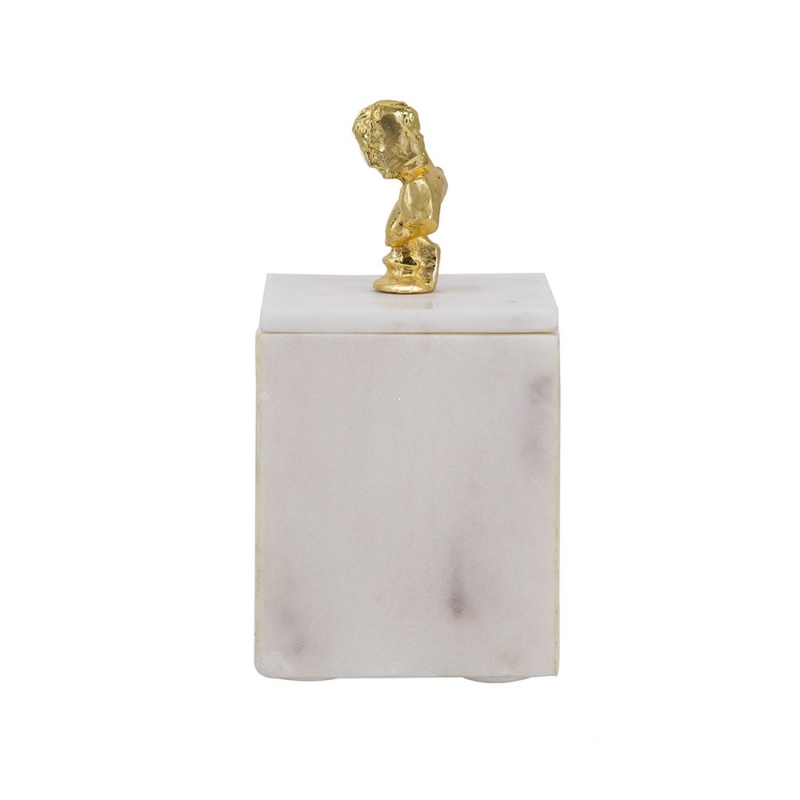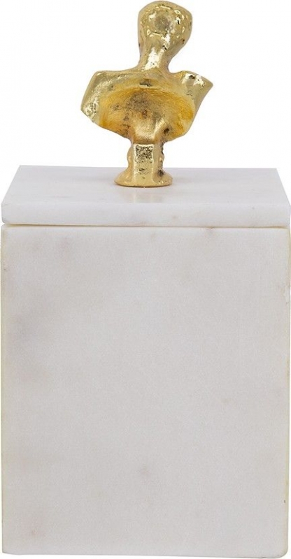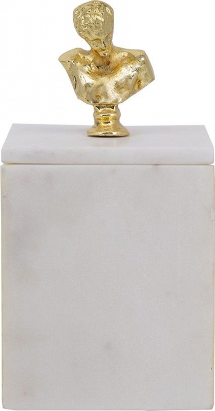Шкатулка Hermes в белом мраморе с золотистой крышкой-скульптурой сочетает в себе лаконичную геометрию и художественный характер. Чистая кубическая форма смотрится строго и современно, а миниатюрный бюст на крышке добавляет интерьеру нотку античной эстетики и дизайнерской выразительности. Светлая мраморная поверхность с естественными прожилками делает каждое изделие визуально живым и благородным. Контраст холодного белого камня и тёплого металлического блеска выглядит изысканно, поэтому шкатулка не теряется в обстановке и легко становится акцентом на консоли, комоде или журнальном столике. Съёмная крышка делает её не только декоративной, но и удобной для хранения мелочей.