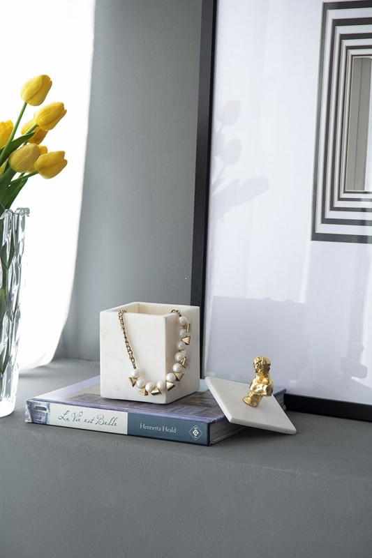 Сдержанная роскошь белого мрамора и выразительный золотистый акцент превращают эту декоративную шкатулку в маленький арт-объект. Она идеально подойдет для спальни, гостиной или кабинета и поможет создать атмосферу утончённости, порядка и тихой элегантности.