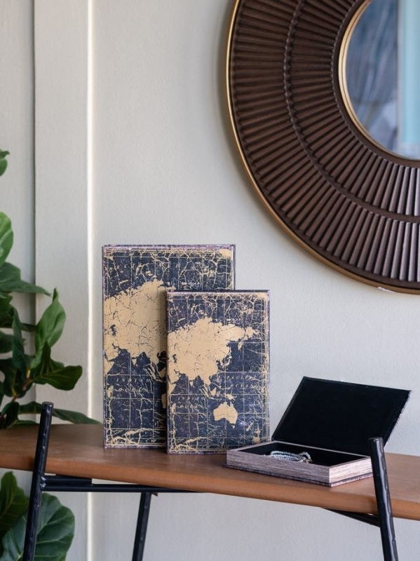 Эффектный комплект шкатулок-книг с состаренной картой мира добавляет интерьеру характер, глубину и ощущение истории. Такой набор идеально подойдет для гостиной, кабинета или спальни и поможет создать атмосферу интеллигентного уюта с нотами путешествий.