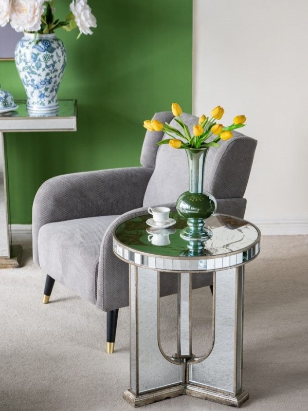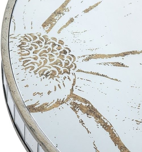 Внешний вид столика «Magnolia» восхищает своей элегантностью. Круглая столешница, украшенная изящным изображением с цветами магнолии и ребристыми зеркальными панелями, создает эффектное сочетание, которое легко впишется в любой интерьер.