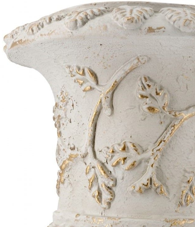 Эта ваза символизирует вневременную элегантность и утонченность. Выполненная в нежных белых и кремовых тонах с золотистыми акцентами, она привносит в интерьер нотки роскоши. Материал — полимер, который обеспечивает лёгкость и долговечность, а детализированная фактура и резные элементы придают ей уникальности. Поверхностные потертости и неровности создают эффект реставрации, что делает каждую вазу поистине неповторимой.