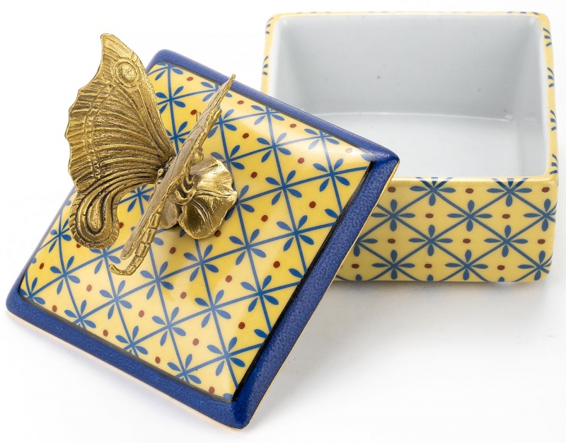 Эта декоративная шкатулка особенно уместна в интерьерах в стиле эклектика, прованс, шинуазри, винтаж и классика с авторскими акцентами. Она красиво смотрится в светлых пространствах с текстилем, цветочными мотивами, натуральным деревом и коллекционным декором. Благодаря сочетанию фарфора, орнамента и бронзовой бабочки модель легко вписывается и в романтичные женственные интерьеры, и в более сложные дизайнерские композиции, где важны детали, фактура и предметы с настроением.