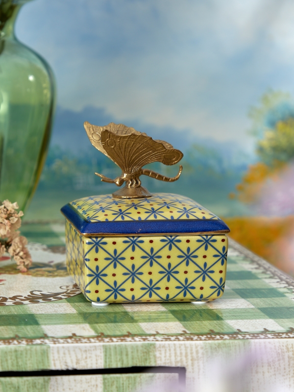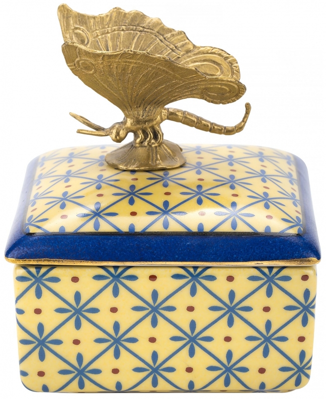 Шкатулка Cai из фарфора в кремово-синей гамме с бронзовой бабочкой выглядит как декоративный предмет с характером и историей. Мягкий тёплый фон корпуса украшен ритмичным геометрическим орнаментом в синих и терракотовых тонах, а насыщенная синяя окантовка подчёркивает форму и делает силуэт более собранным. Крышку венчает объёмная фигурка бабочки из металла бронзового оттенка — она добавляет композиции пластичность, благородный блеск и ощущение ручной работы. Гладкий фарфор сочетается с выразительной фактурой металлических элементов, создавая баланс между хрупкостью, декоративностью и винтажным шармом.