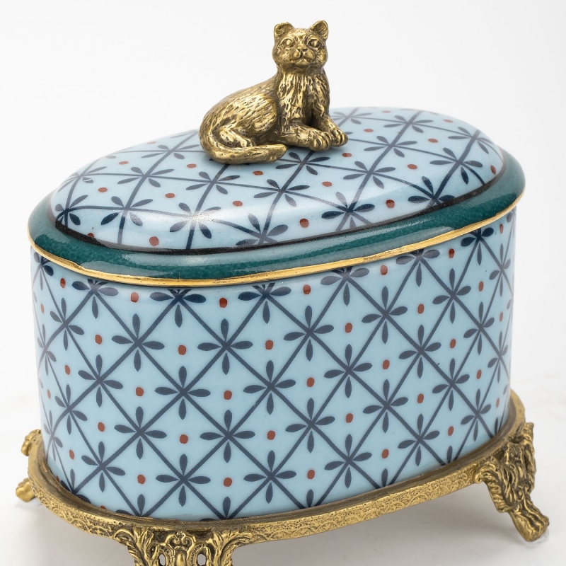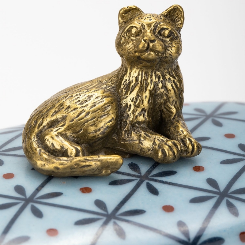 «Cian» голубая фарфоровая шкатулка с бронзовой кошкой | восточная эклектика | декоративное хранение от HomeAdore