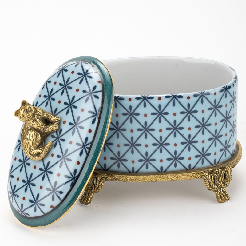 Шкатулка Cian в голубом цвете из фарфора с бронзовыми элементами выглядит утончённо и характерно. Овальный корпус украшен ритмичным геометрическим узором в тёмно-синих и терракотовых оттенках, благодаря чему поверхность смотрится живой и декоративной. Крышку венчает миниатюрная фигурка кошки с благородной бронзовой патиной — именно она придаёт изделию особое настроение и коллекционный шарм. Основание на ажурных ножках поддерживает винтажное звучание формы, а тонкая золотистая окантовка аккуратно подчеркивает силуэт. Фарфоровая поверхность дополнена характерным кракелюром, который создаётся по специальной технологии и усиливает ощущение вещи с историей, тёплой, редкой и по-настоящему интерьерной.