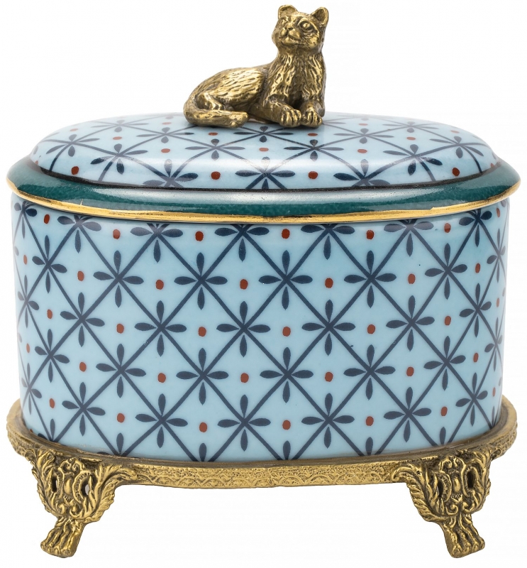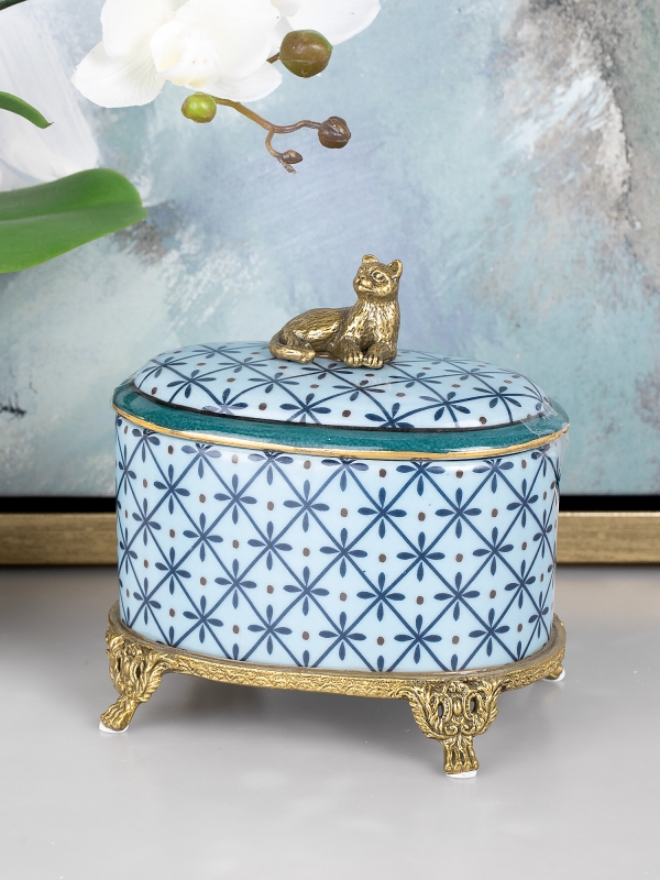 Изящная шкатулка из фарфора с бронзовыми элементами соединяет декоративность и практичность. Нежный голубой фон, графичный орнамент и фигурка кошки на крышке делают её выразительным акцентом. Этот вариант идеально подойдет для спальни, гостиной или туалетного столика и поможет создать атмосферу уюта, собранности и тонкого вкуса.