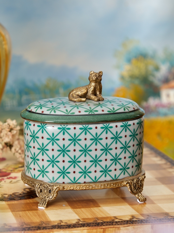 Шкатулка Cian HomeAdore из белого фарфора с зелёным орнаментом и бронзовыми элементами выглядит как коллекционный интерьерный акцент с тонким винтажным настроением. Овально-цилиндрическая форма смягчает силуэт, а крышку украшает миниатюрная фигурка кошки, которая делает образ особенно живым и запоминающимся. Белая основа покрыта ритмичным геометрическим узором в зелёных оттенках с деликатными терракотовыми точками, а кант и ажурные ножки в оттенке состаренной бронзы добавляют глубину и благородство. Ручная работа и характерные кракелюры усиливают ощущение редкой вещи с историей, поэтому шкатулка смотрится не просто практичным аксессуаром, а полноценным предметом дизайнерского декора.