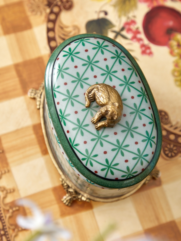Эта декоративная шкатулка органично смотрится в классическом интерьере, винтажной обстановке, эклектике, стиле шинуазри и в уютных пространствах с французскими нотами. Она красиво поддерживает интерьеры с латунной фурнитурой, фарфором, зеркалами, туалетными столиками и текстилем природных оттенков. Благодаря бело-зелёной гамме шкатулка легко вписывается и в более светлые современные интерьеры, где нужен выразительный акцент без визуальной тяжести. Особенно удачно она сочетается с деревом, мраморными поверхностями, декоративными подносами и камерным мягким светом.
