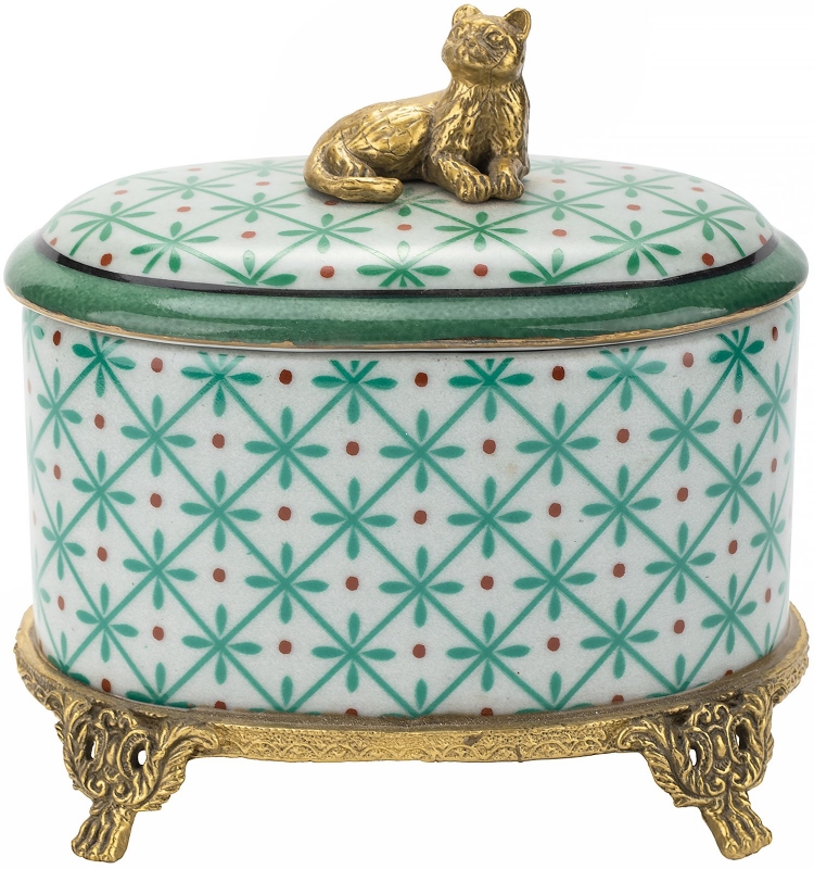 «Шкатулка Cian» в бело-зелёной палитре с фигуркой кошки | Винтажная эклектика | изящный декор от HomeAdore