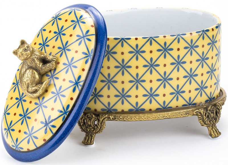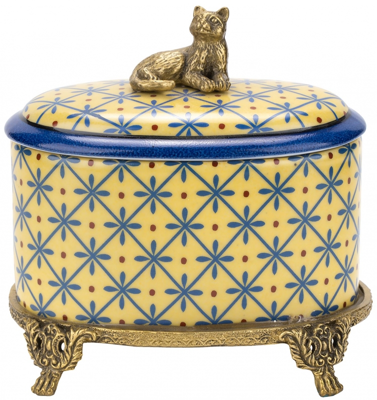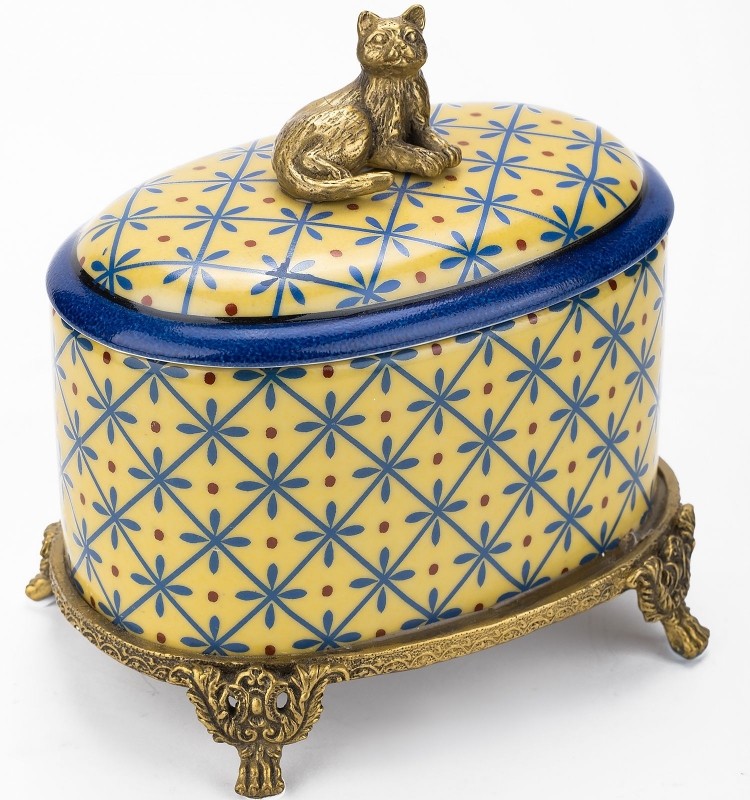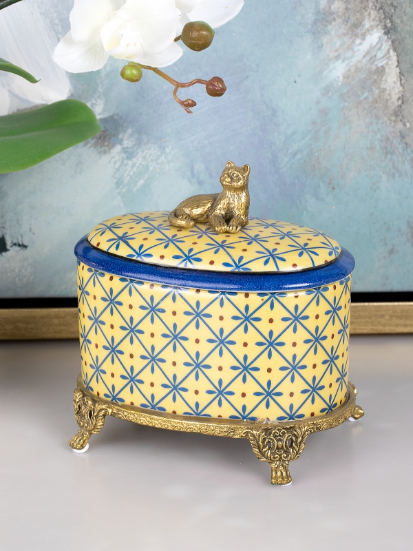 Шкатулка Cian в кремово-синем цвете из фарфора с бронзовыми элементами выглядит как маленький интерьерный акцент с коллекционным характером. Овальная форма смягчает силуэт, а орнамент из синих геометричных цветочных мотивов и терракотовых точек делает образ живым и запоминающимся. Насыщенный синий кант подчеркивает контур крышки и корпуса, добавляя выразительности. Особое очарование придает бронзовая фигурка кошки на крышке: она служит не только декором, но и красивым акцентом с теплым металлическим блеском. Ажурные ножки и основание в бронзовом тоне усиливают винтажное звучание, а легкий кракелюрный эффект придает вещи благородный вид предмета с историей.
