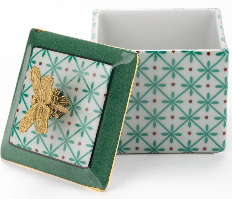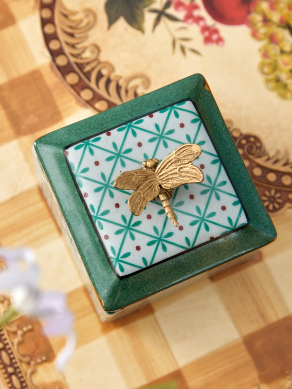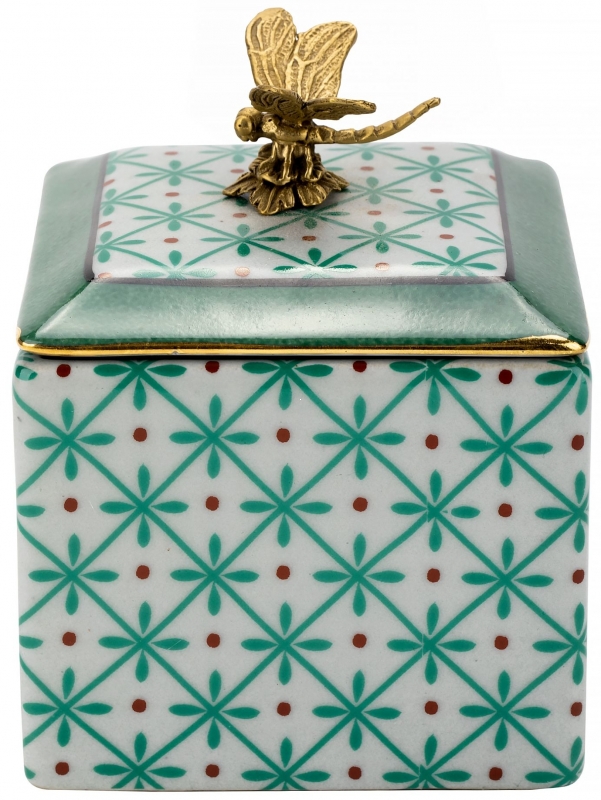 Нежная фарфоровая шкатулка с графичным зелёным орнаментом, бронзовой стрекозой и тонкими золотистыми акцентами добавляет интерьеру характер и ощущение коллекционной вещи. Этот вариант идеально подойдет для спальни, гостиной или туалетного столика и поможет создать атмосферу уюта, утончённости и тихой роскоши.