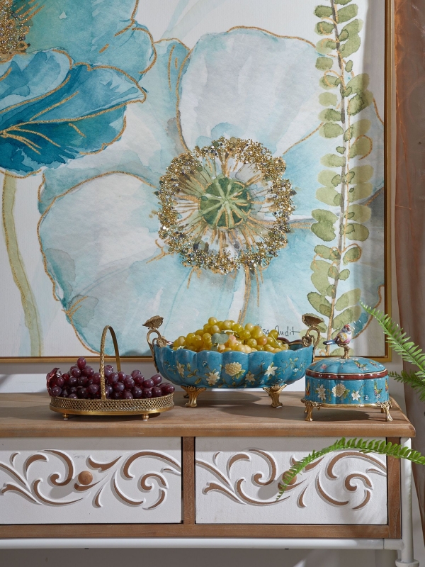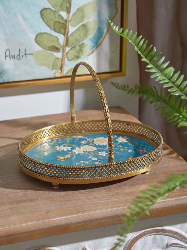 Изящный декоративный поднос с ручкой объединяет небесно-бирюзовый фон, цветочный орнамент и теплый блеск бронзовых элементов. Этот вариант идеально подойдет для консоли, комода или журнального столика и поможет создать атмосферу утончённого уюта с нотами восточной эстетики.