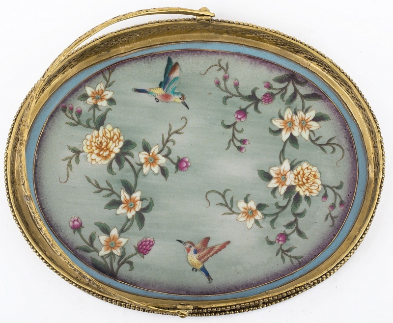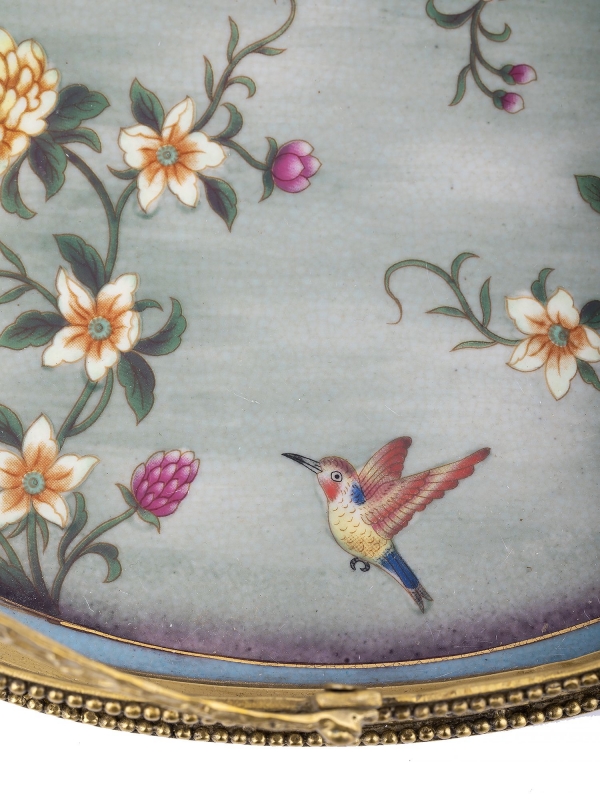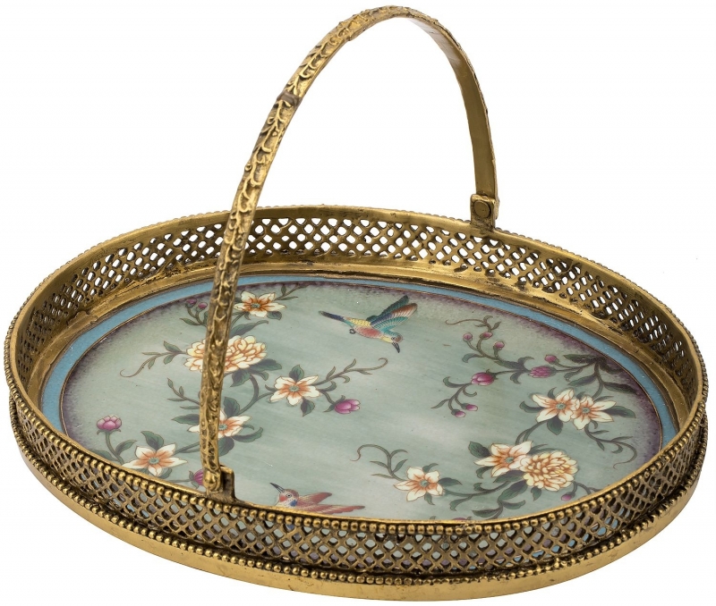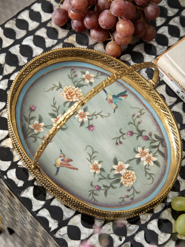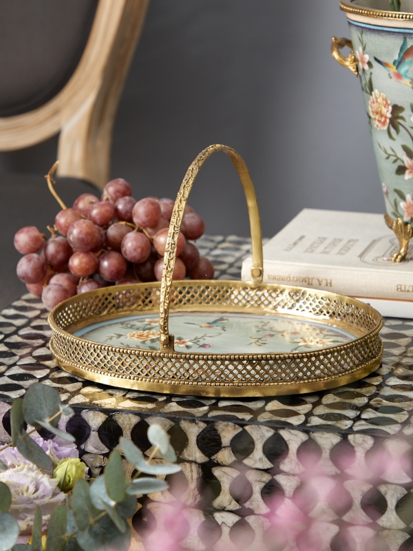 Изящное декоративное блюдо с ручкой сочетает фарфор, ажурный металл и тонкую роспись с птицами и цветами. Этот вариант идеально подойдет для консоли, журнального столика или комода и поможет создать атмосферу утончённого уюта с винтажным настроением.