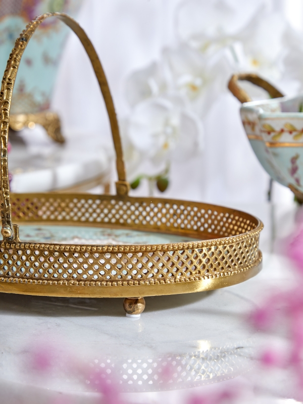Декоративный поднос Olorun из фарфора с бронзовыми элементами выполнен в нежной голубовато-бирюзовой гамме с теплым золотистым обрамлением. Овальная форма выглядит мягко и элегантно, а высокая изогнутая ручка придает силуэту выразительность и делает композицию особенно декоративной. Центральный рисунок с птицей, цветочными мотивами и изящными завитками отсылает к классическим европейским интерьерам и коллекционному фарфору. Ажурный металлический бортик подчеркивает тонкость работы, а кракелюрная поверхность добавляет ощущение благородной старины. Такой поднос украшает пространство даже тогда, когда просто стоит на консоли, столике или витрине.