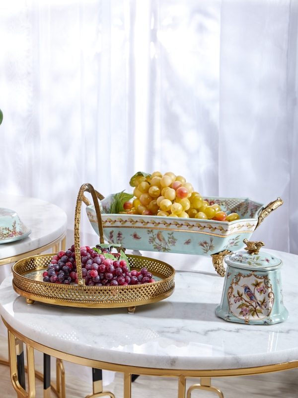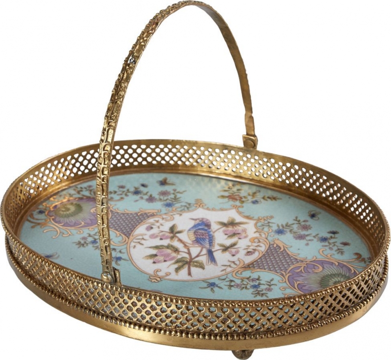 Изящный декоративный поднос с ручкой соединяет фарфор, бронзовые элементы и тонкий орнамент с птицей и цветами. Он идеально подойдет для гостиной, столовой или будуара и поможет создать атмосферу аристократичной легкости, уюта и утончённого вкуса.